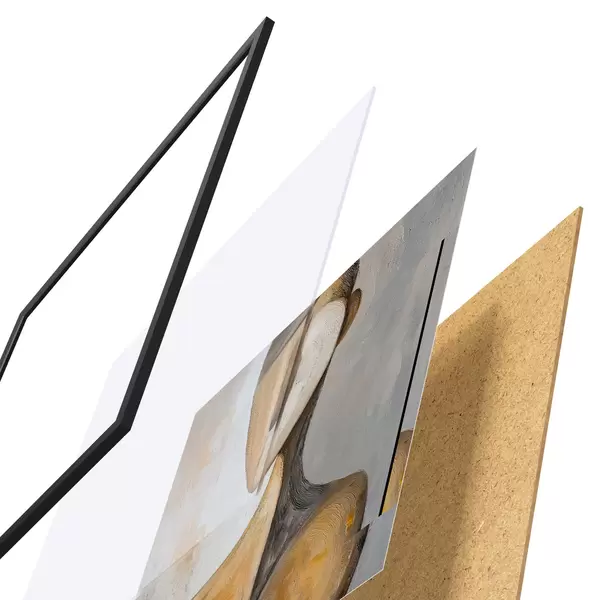 Plagát sa skladá z rámu, plexiskla, vytlačeného obrazu a podkladu z drevotriesky. Plagát možno okamžite zavesiť na stenu vďaka úchytom na zadnej strane.