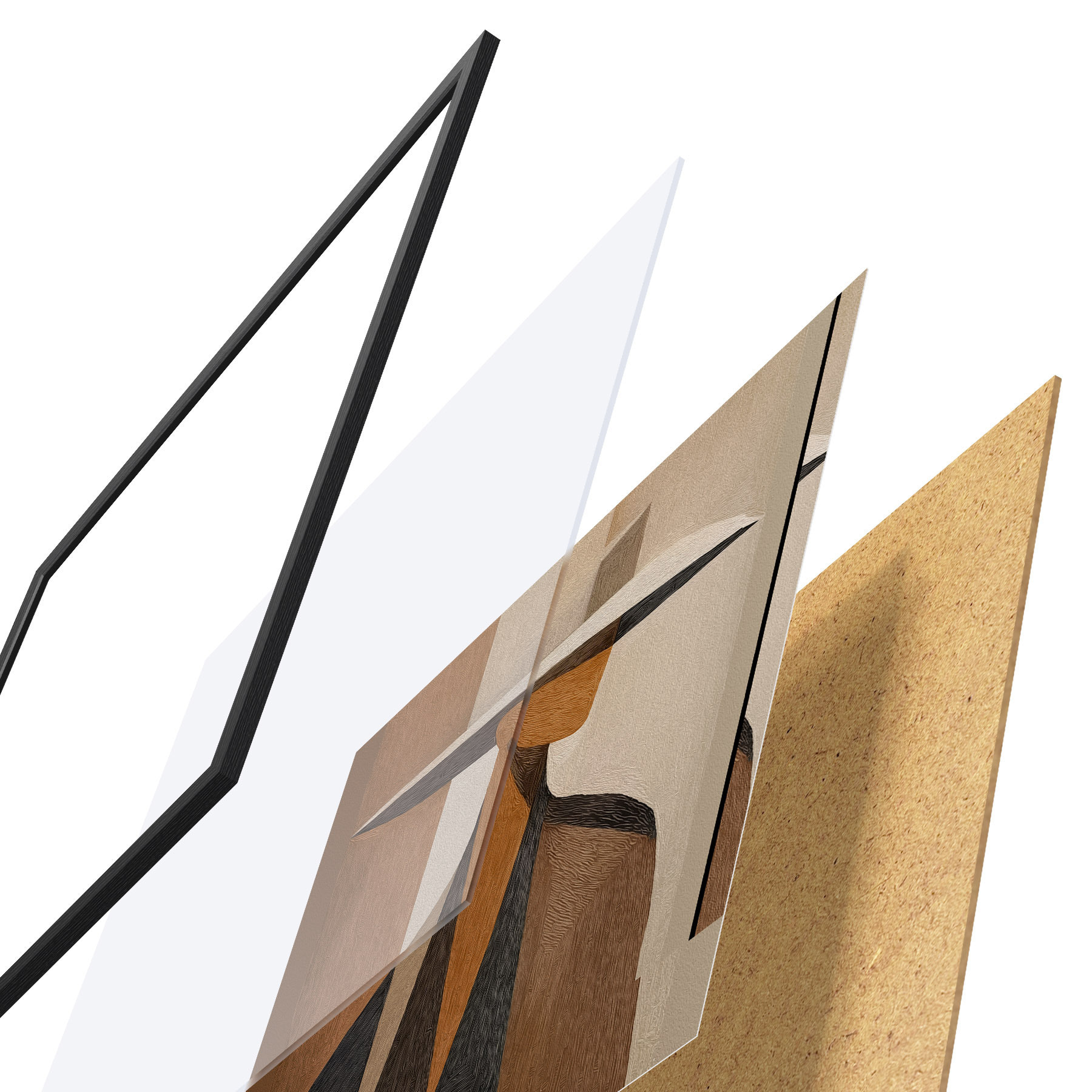 Plagát sa skladá z rámu, plexiskla, vytlačeného obrazu a podkladu z drevotriesky. Plagát možno okamžite zavesiť na stenu vďaka úchytom na zadnej strane.