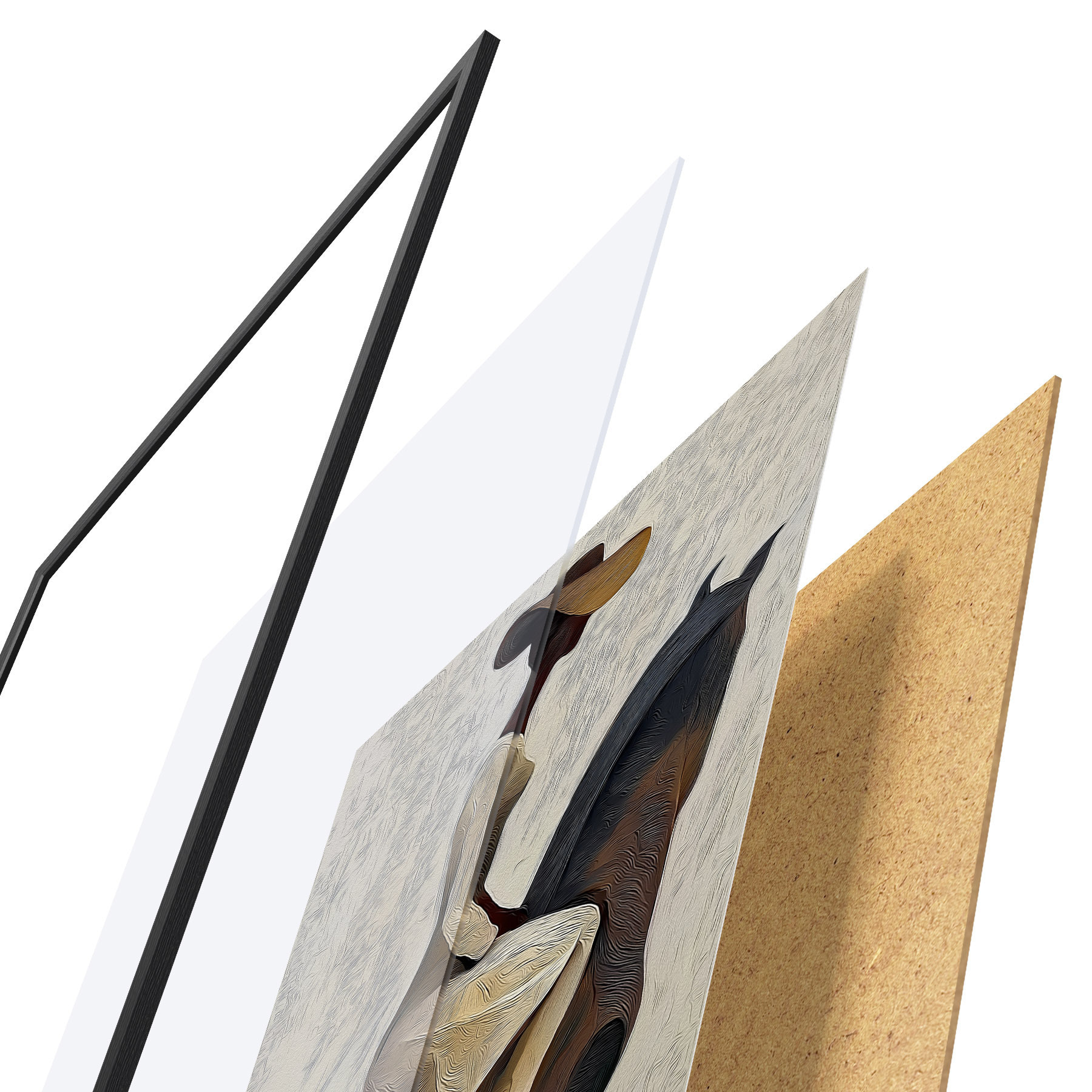 Plagát sa skladá z rámu, plexiskla, vytlačeného obrazu a podkladu z drevotriesky. Plagát možno okamžite zavesiť na stenu vďaka úchytom na zadnej strane.