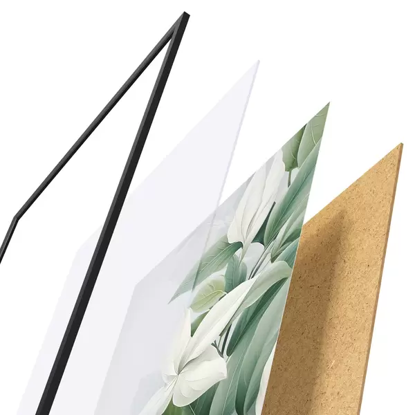 Plagát sa skladá z rámu, plexiskla, vytlačeného obrazu a podkladu z drevotriesky. Plagát možno okamžite zavesiť na stenu vďaka úchytom na zadnej strane.