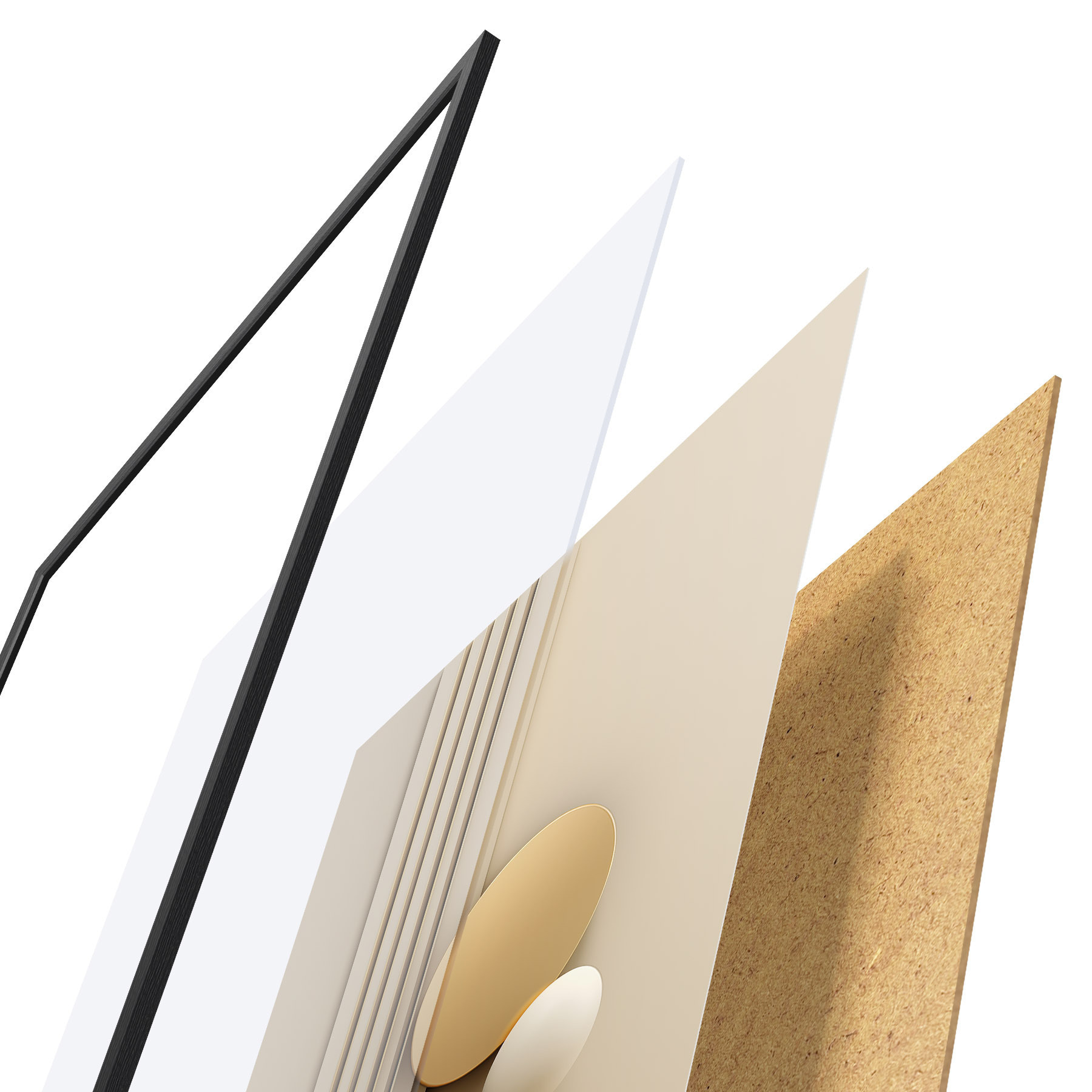 Plagát sa skladá z rámu, plexiskla, vytlačeného obrazu a podkladu z drevotriesky. Plagát možno okamžite zavesiť na stenu vďaka úchytom na zadnej strane.