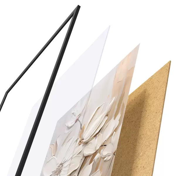 Plagát sa skladá z rámu, plexiskla, vytlačeného obrazu a podkladu z drevotriesky. Plagát možno okamžite zavesiť na stenu vďaka úchytom na zadnej strane.