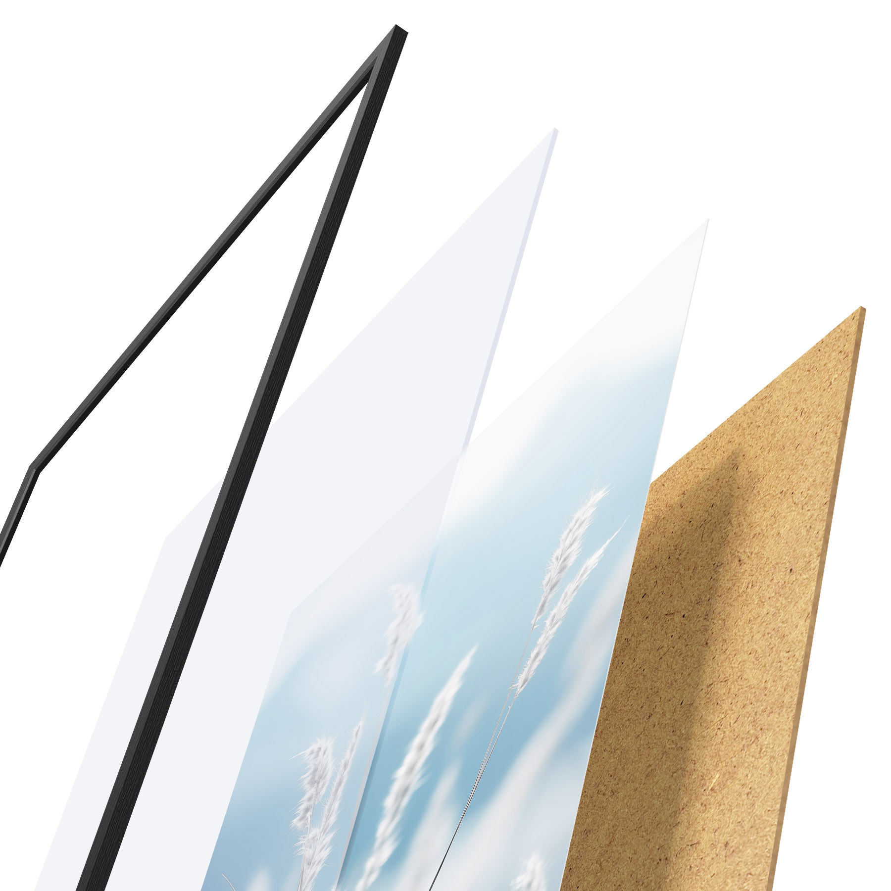 Plagát sa skladá z rámu, plexiskla, vytlačeného obrazu a podkladu z drevotriesky. Plagát možno okamžite zavesiť na stenu vďaka úchytom na zadnej strane.
