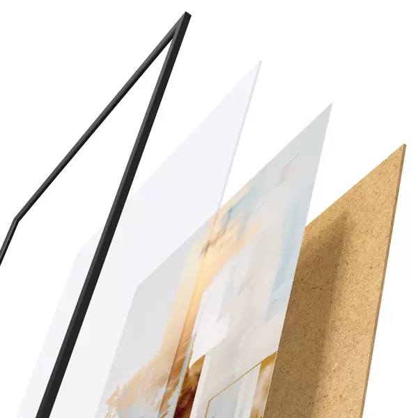 Plagát sa skladá z rámu, plexiskla, vytlačeného obrazu a podkladu z drevotriesky. Plagát možno okamžite zavesiť na stenu vďaka úchytom na zadnej strane.