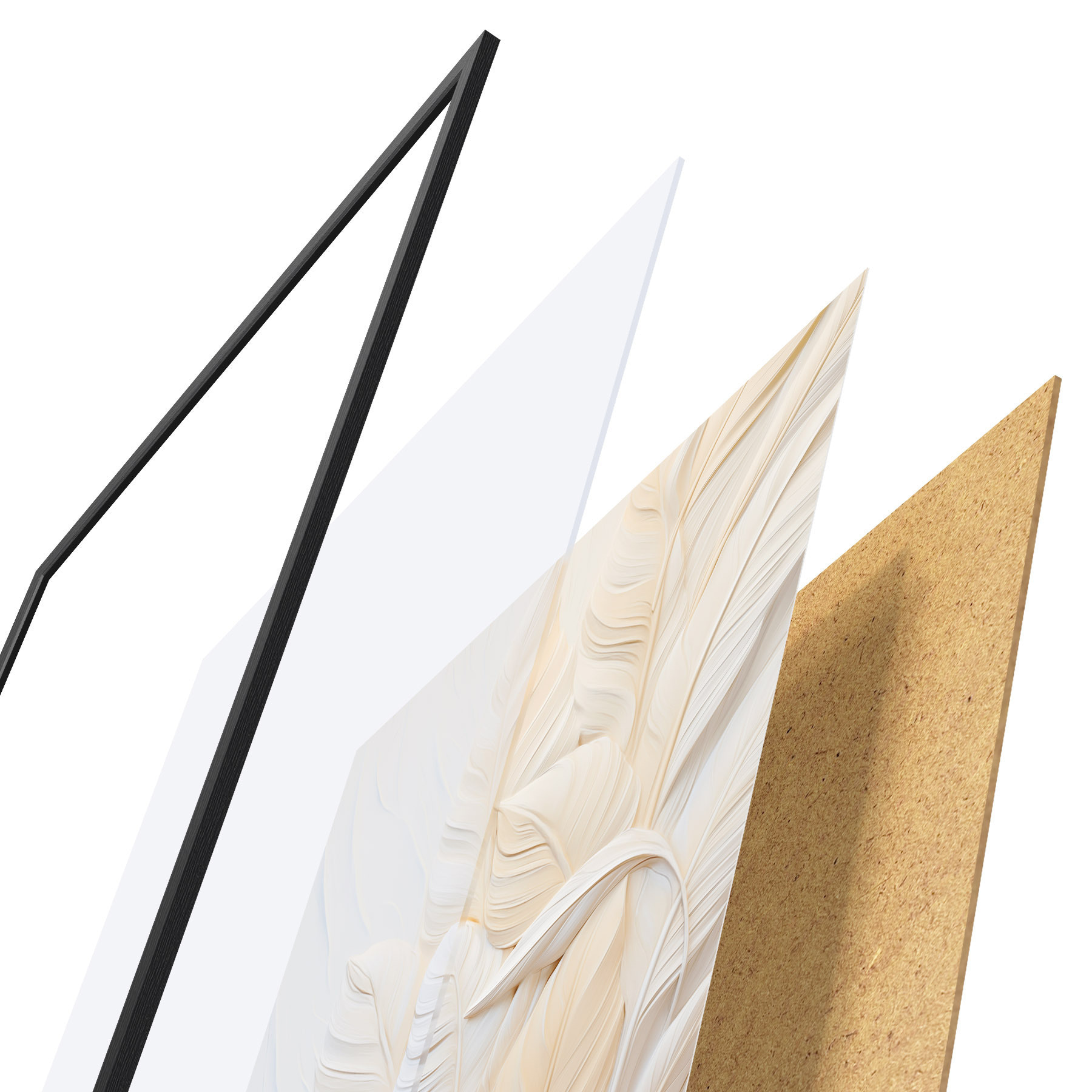 Plagát sa skladá z rámu, plexiskla, vytlačeného obrazu a podkladu z drevotriesky. Plagát možno okamžite zavesiť na stenu vďaka úchytom na zadnej strane.