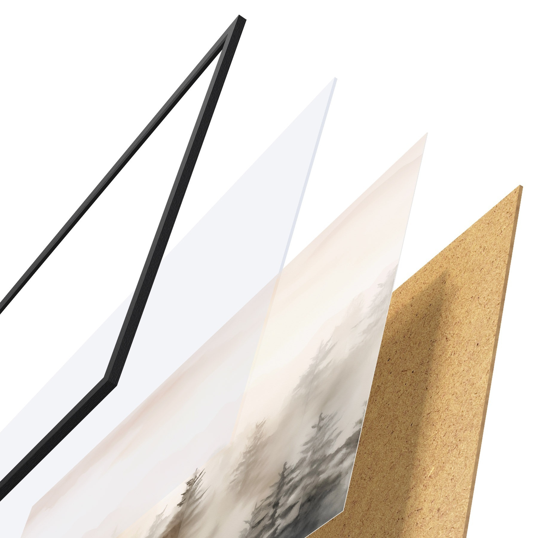 Plagát sa skladá z rámu, plexiskla, vytlačeného obrazu a podkladu z drevotriesky. Plagát možno okamžite zavesiť na stenu vďaka úchytom na zadnej strane.