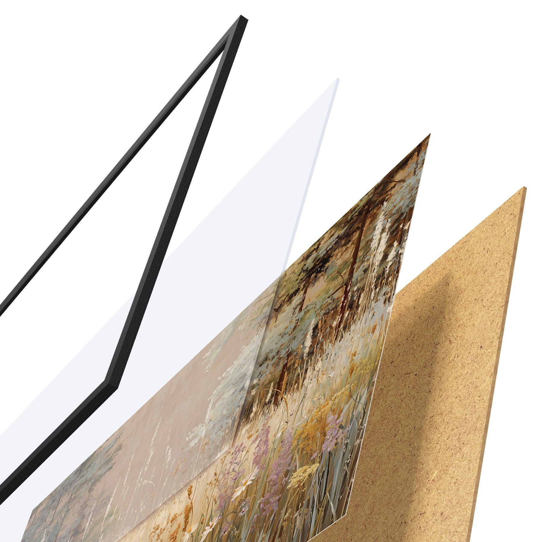 Plagát sa skladá z rámu, plexiskla, vytlačeného obrazu a podkladu z drevotriesky. Plagát možno okamžite zavesiť na stenu vďaka úchytom na zadnej strane.
