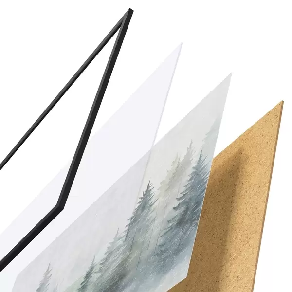 Plagát sa skladá z rámu, plexiskla, vytlačeného obrazu a podkladu z drevotriesky. Plagát možno okamžite zavesiť na stenu vďaka úchytom na zadnej strane.