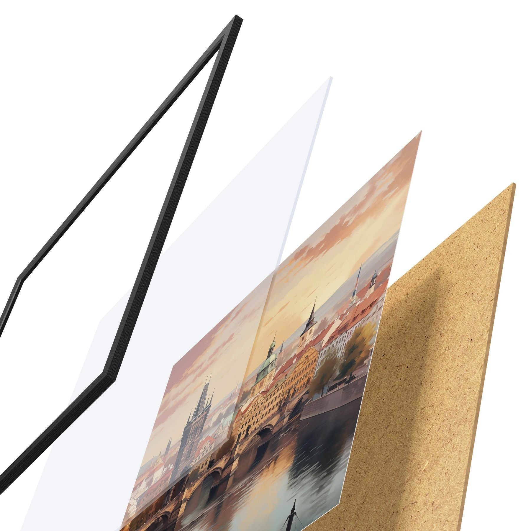 Plagát sa skladá z rámu, plexiskla, vytlačeného obrazu a podkladu z drevotriesky. Plagát možno okamžite zavesiť na stenu vďaka úchytom na zadnej strane.