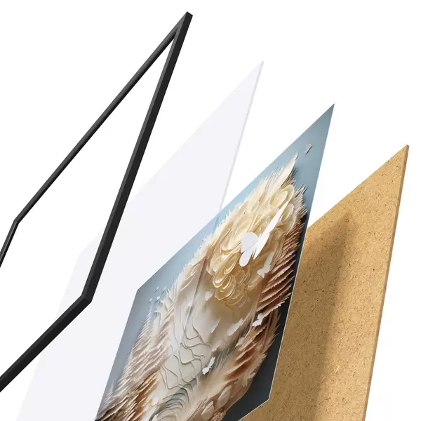 Plagát sa skladá z rámu, plexiskla, vytlačeného obrazu a podkladu z drevotriesky. Plagát možno okamžite zavesiť na stenu vďaka úchytom na zadnej strane.