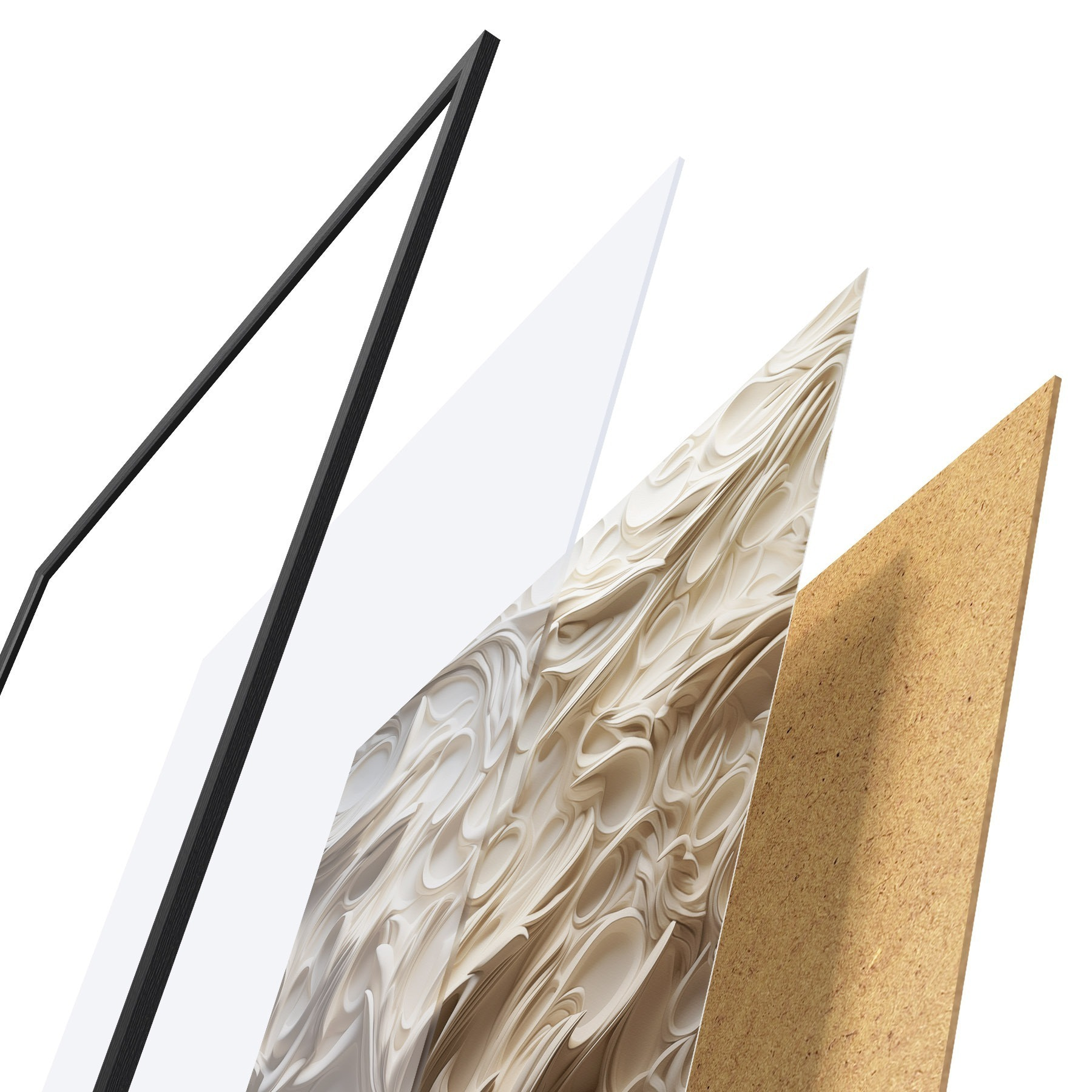 Plagát sa skladá z rámu, plexiskla, vytlačeného obrazu a podkladu z drevotriesky. Plagát možno okamžite zavesiť na stenu vďaka úchytom na zadnej strane.