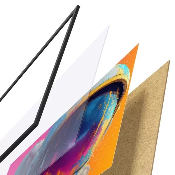 Plagát sa skladá z rámu, plexiskla, vytlačeného obrazu a podkladu z drevotriesky. Plagát možno okamžite zavesiť na stenu vďaka úchytom na zadnej strane.