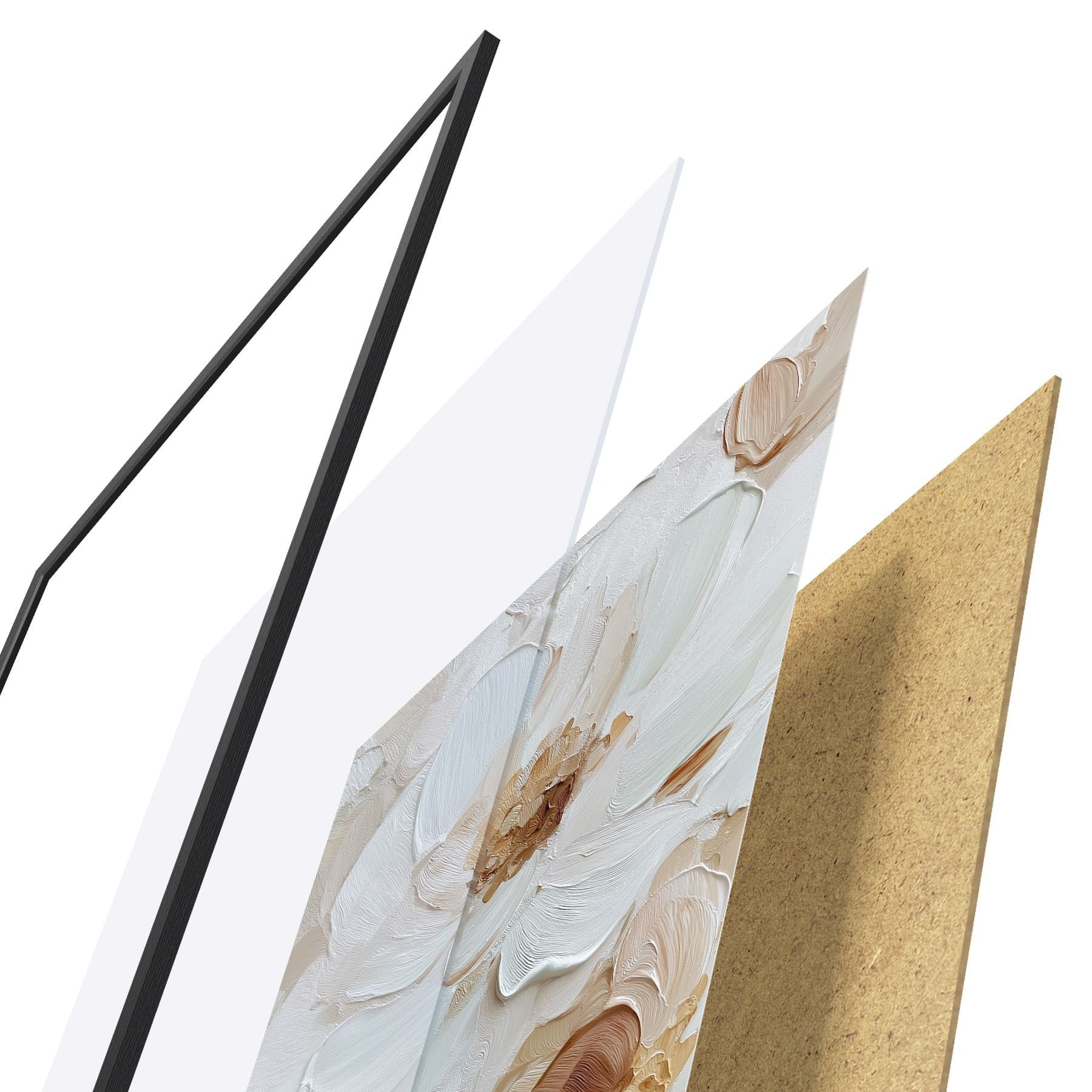 Plagát sa skladá z rámu, plexiskla, vytlačeného obrazu a podkladu z drevotriesky. Plagát možno okamžite zavesiť na stenu vďaka úchytom na zadnej strane.