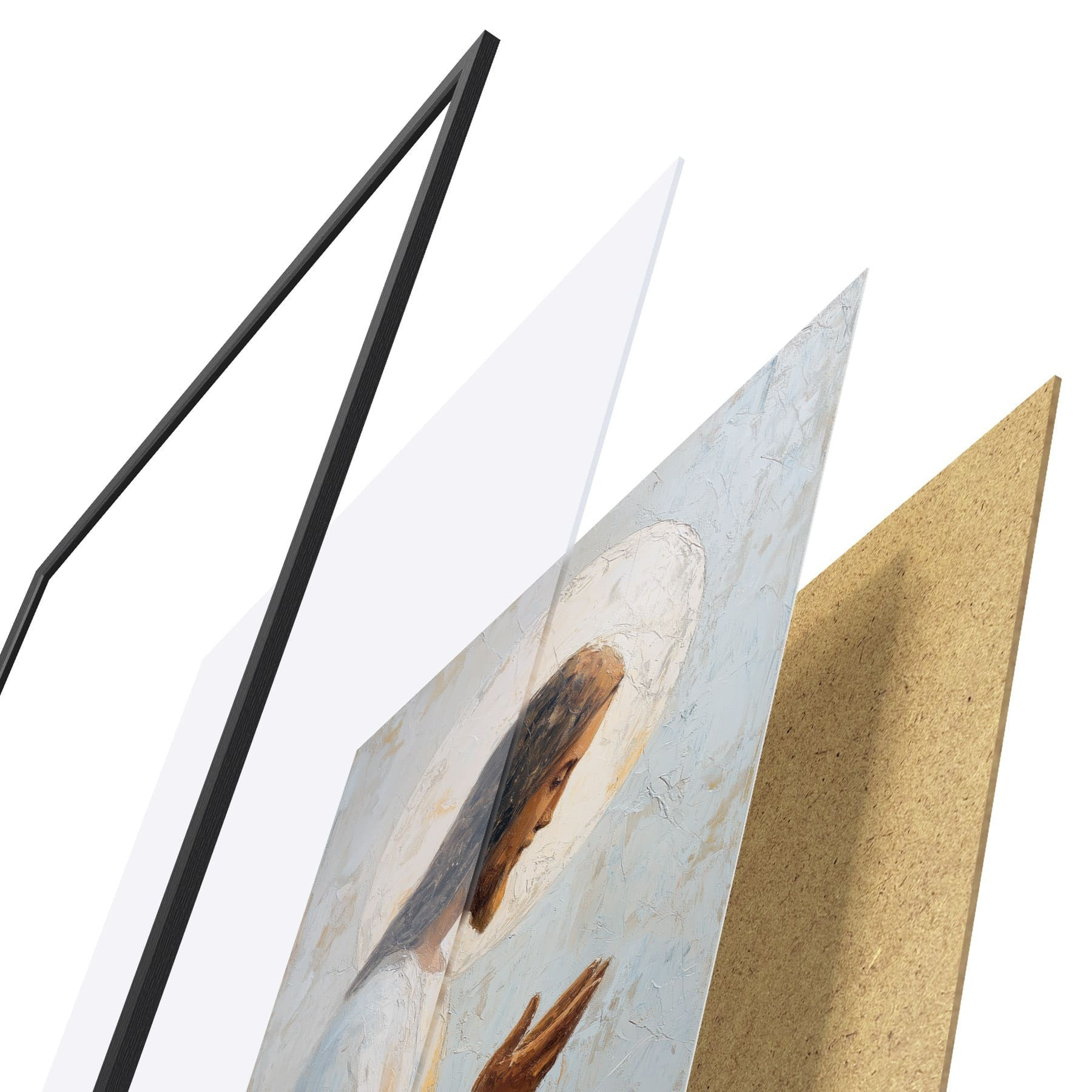 Plagát sa skladá z rámu, plexiskla, vytlačeného obrazu a podkladu z drevotriesky. Plagát možno okamžite zavesiť na stenu vďaka úchytom na zadnej strane.