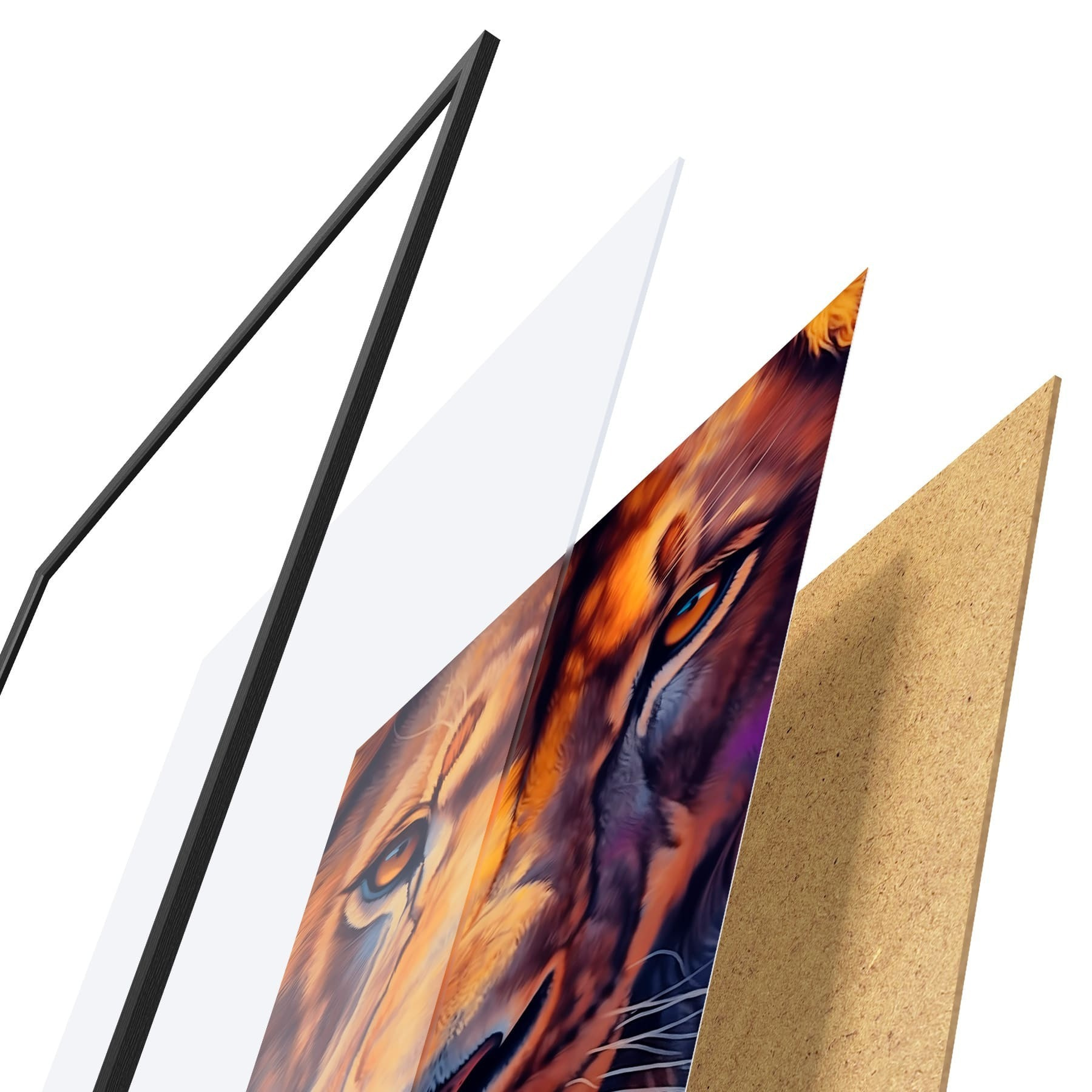 Plagát sa skladá z rámu, plexiskla, vytlačeného obrazu a podkladu z drevotriesky. Plagát možno okamžite zavesiť na stenu vďaka úchytom na zadnej strane.