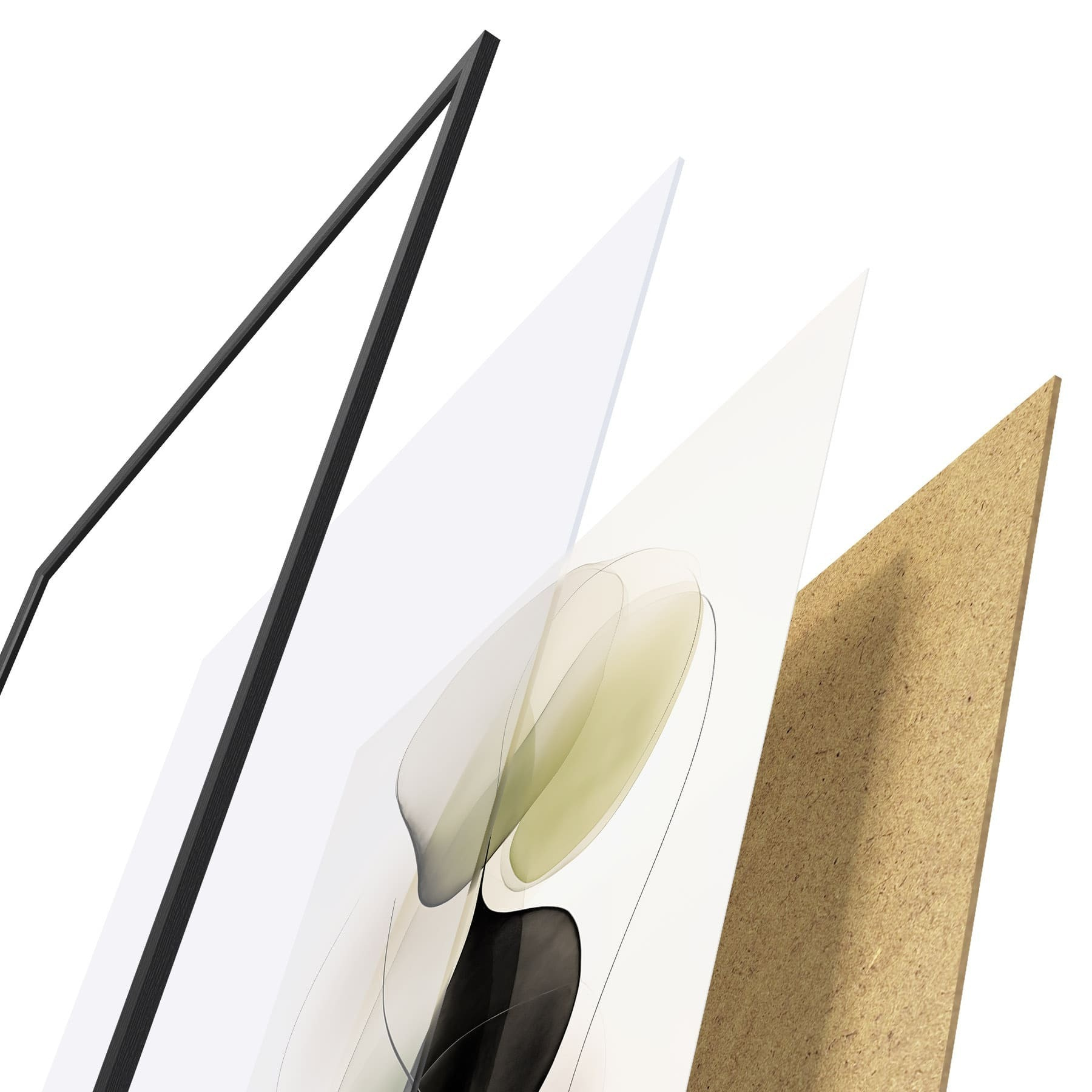 Plagát sa skladá z rámu, plexiskla, vytlačeného obrazu a podkladu z drevotriesky. Plagát možno okamžite zavesiť na stenu vďaka úchytom na zadnej strane.