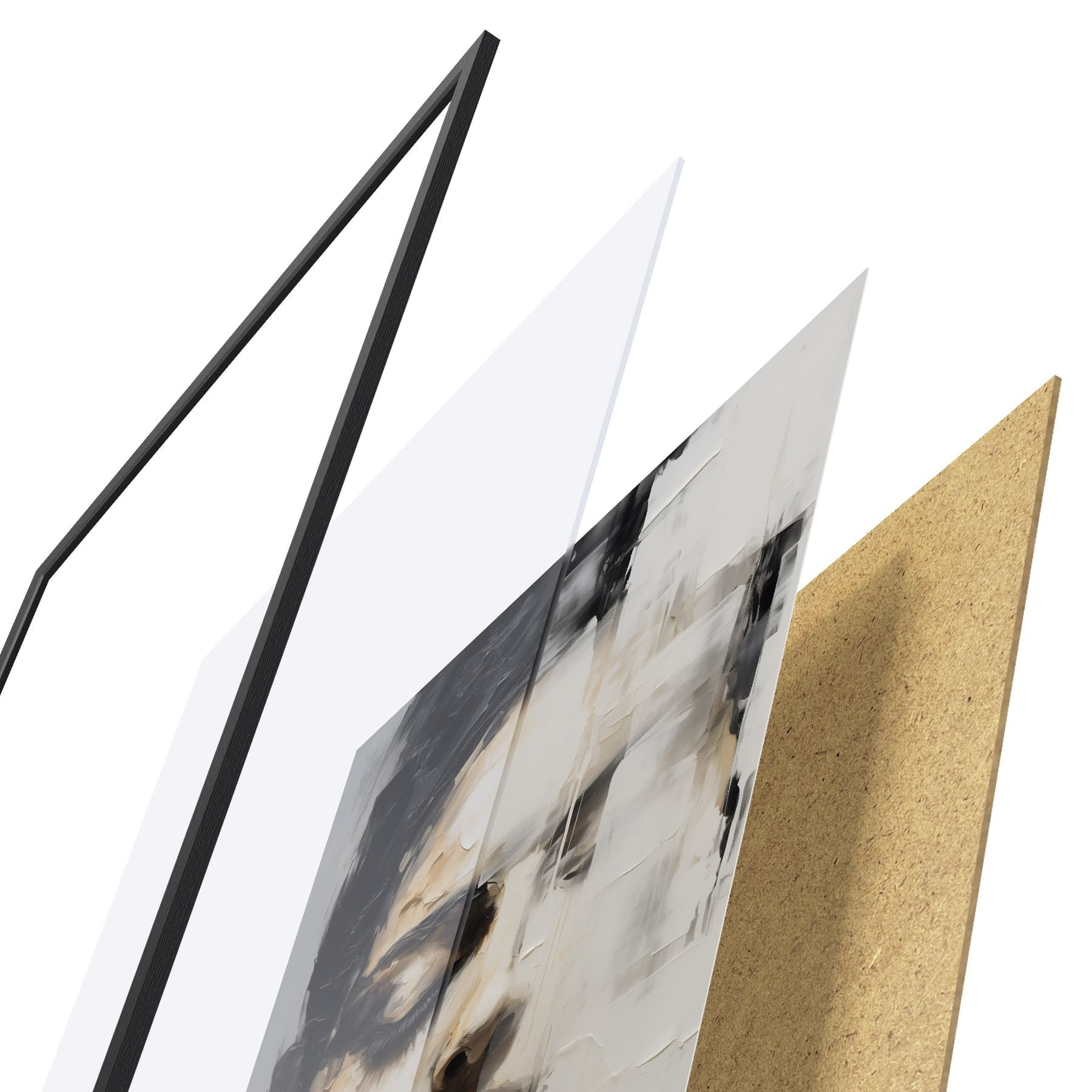 Plagát sa skladá z rámu, plexiskla, vytlačeného obrazu a podkladu z drevotriesky. Plagát možno okamžite zavesiť na stenu vďaka úchytom na zadnej strane.