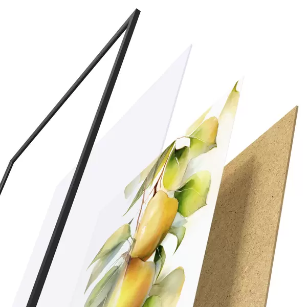 Plagát sa skladá z rámu, plexiskla, vytlačeného obrazu a podkladu z drevotriesky. Plagát možno okamžite zavesiť na stenu vďaka úchytom na zadnej strane.