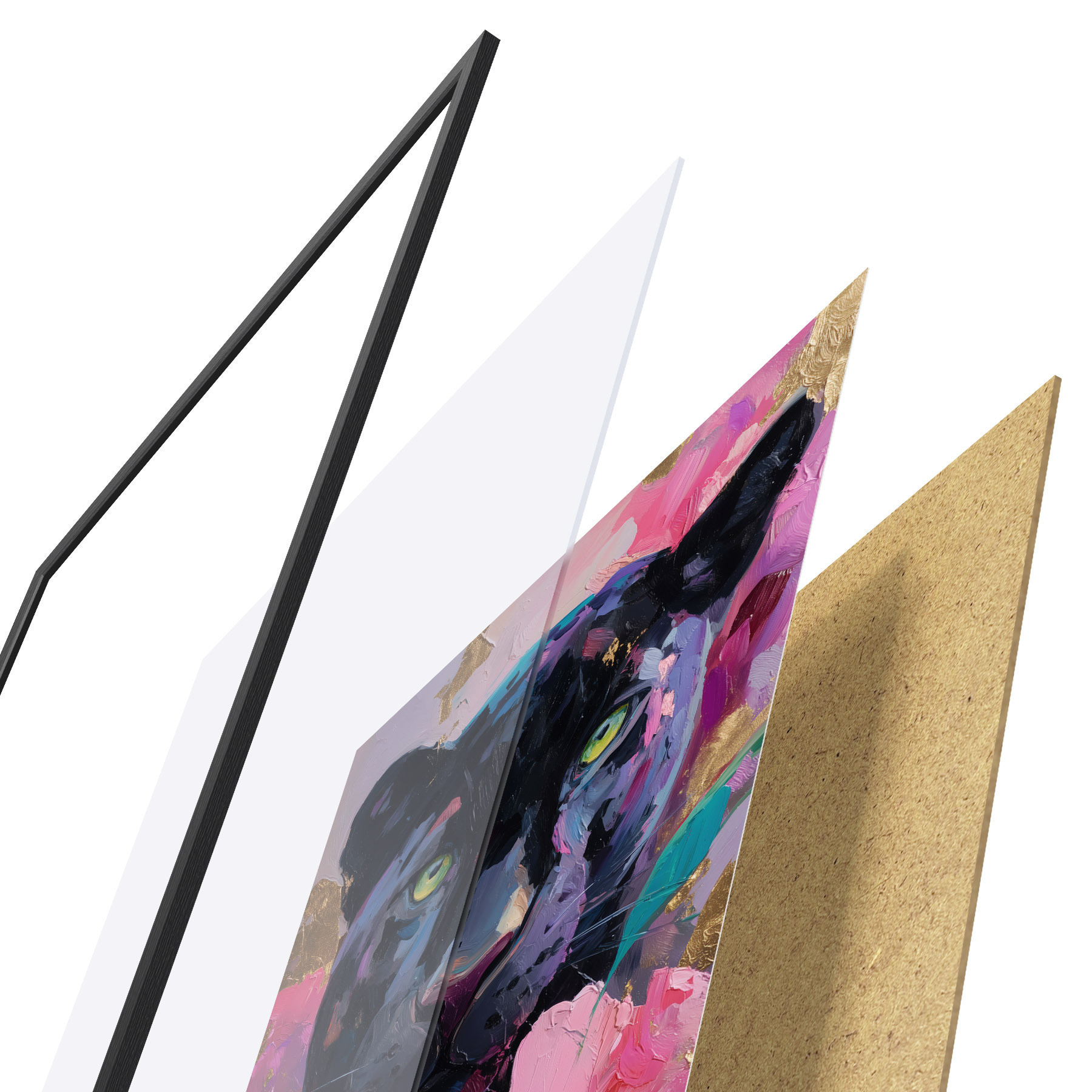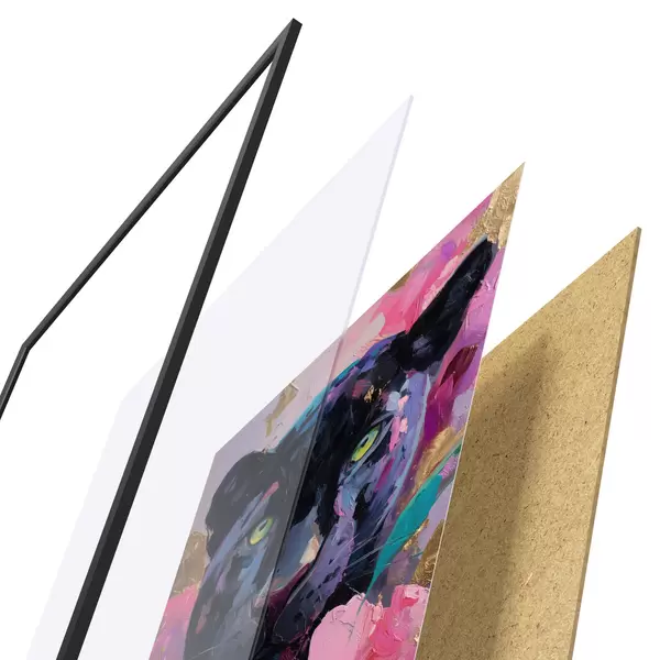 Plagát sa skladá z rámu, plexiskla, vytlačeného obrazu a podkladu z drevotriesky. Plagát možno okamžite zavesiť na stenu vďaka úchytom na zadnej strane.