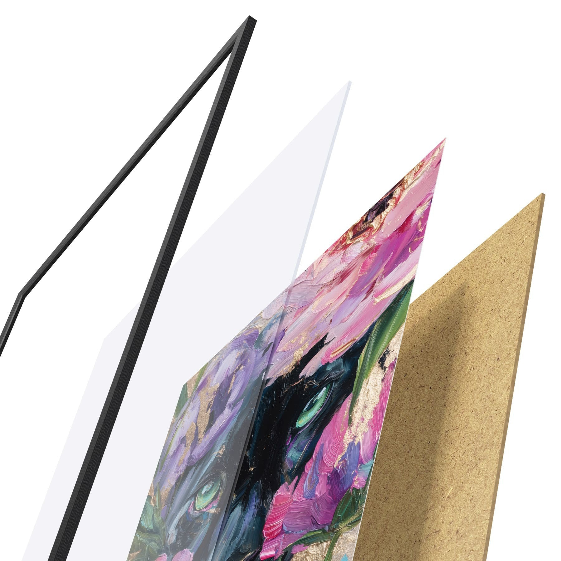 Plagát sa skladá z rámu, plexiskla, vytlačeného obrazu a podkladu z drevotriesky. Plagát možno okamžite zavesiť na stenu vďaka úchytom na zadnej strane.