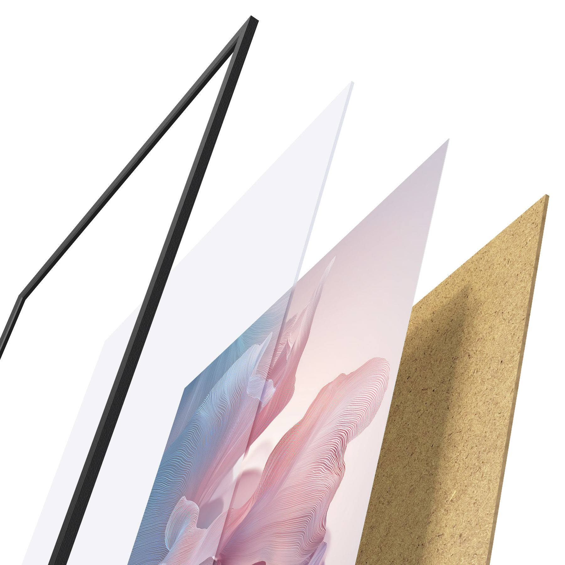 Plagát sa skladá z rámu, plexiskla, vytlačeného obrazu a podkladu z drevotriesky. Plagát možno okamžite zavesiť na stenu vďaka úchytom na zadnej strane.
