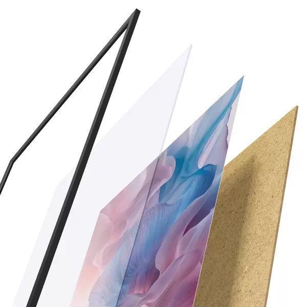 Plagát sa skladá z rámu, plexiskla, vytlačeného obrazu a podkladu z drevotriesky. Plagát možno okamžite zavesiť na stenu vďaka úchytom na zadnej strane.