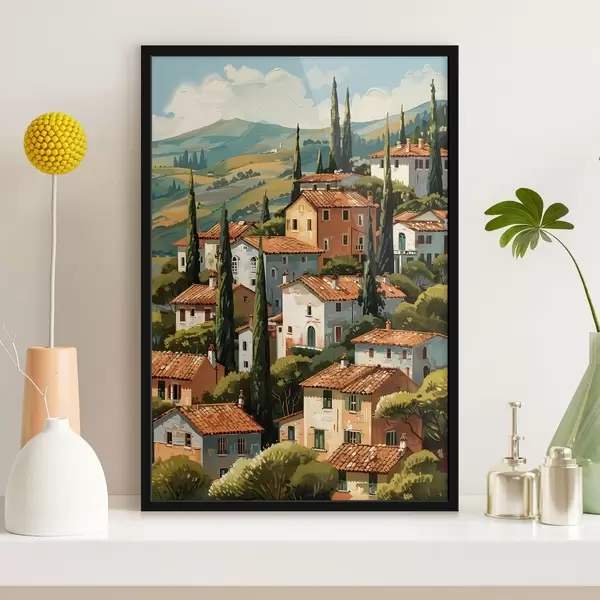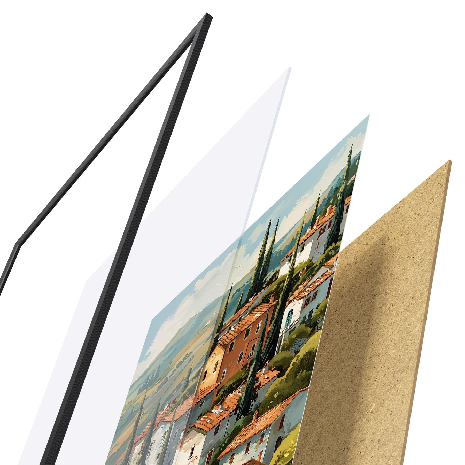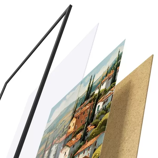 Plagát sa skladá z rámu, plexiskla, vytlačeného obrazu a podkladu z drevotriesky. Plagát možno okamžite zavesiť na stenu vďaka úchytom na zadnej strane.