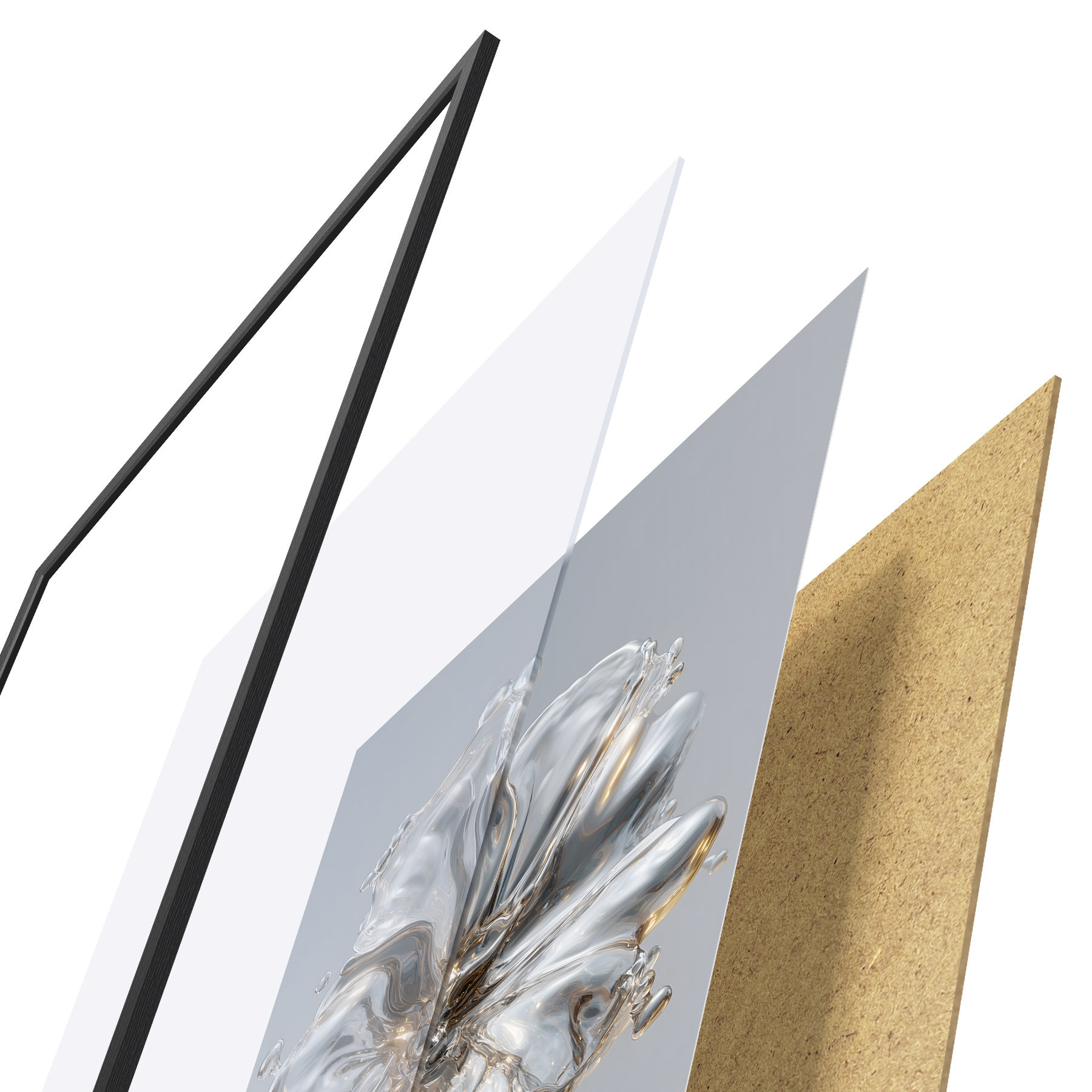 Plagát sa skladá z rámu, plexiskla, vytlačeného obrazu a podkladu z drevotriesky. Plagát možno okamžite zavesiť na stenu vďaka úchytom na zadnej strane.