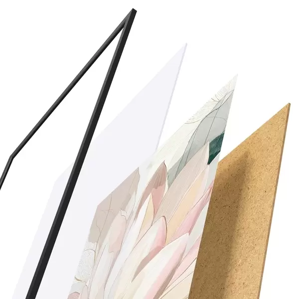 Plagát sa skladá z rámu, plexiskla, vytlačeného obrazu a podkladu z drevotriesky. Plagát možno okamžite zavesiť na stenu vďaka úchytom na zadnej strane.