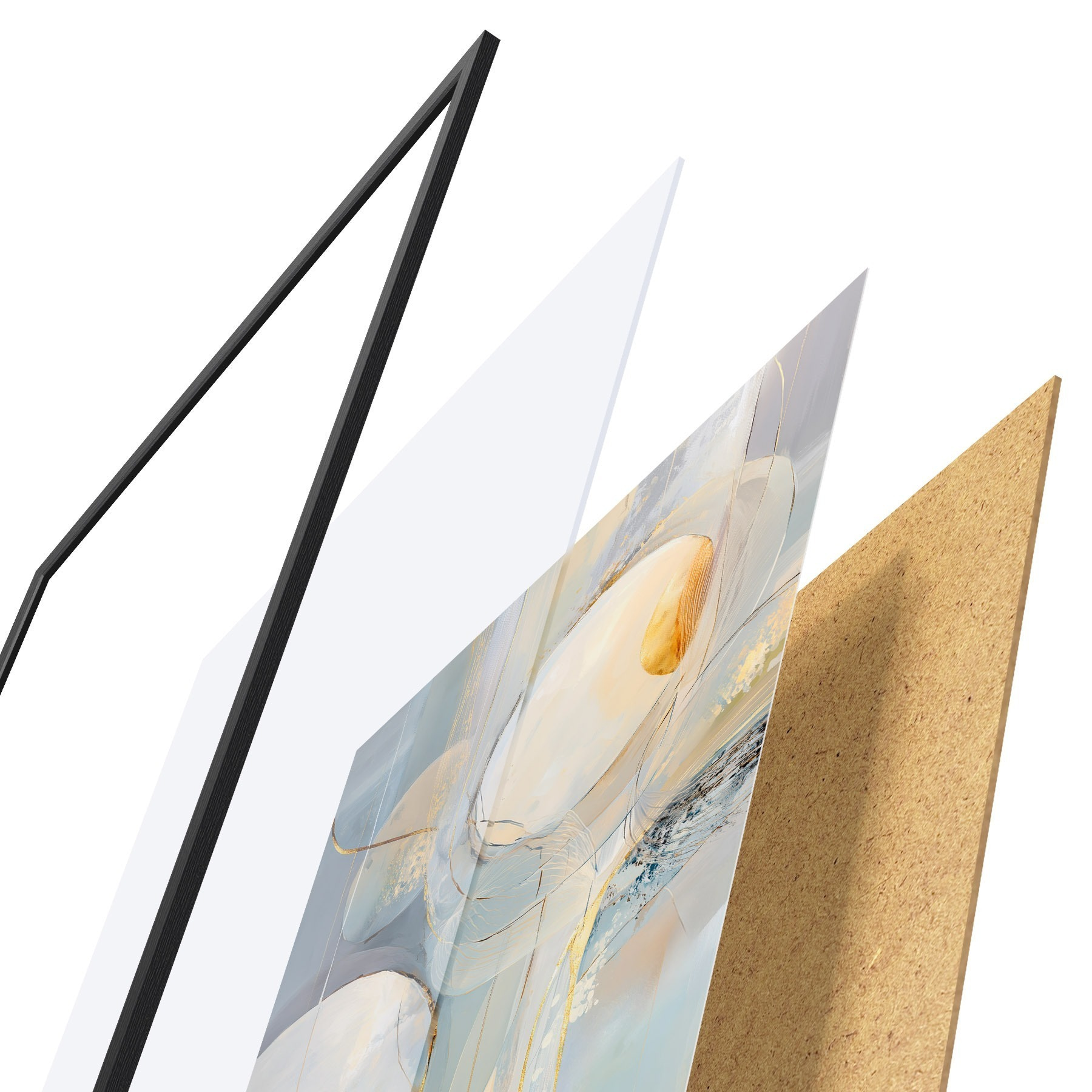 Plagát sa skladá z rámu, plexiskla, vytlačeného obrazu a podkladu z drevotriesky. Plagát možno okamžite zavesiť na stenu vďaka úchytom na zadnej strane.