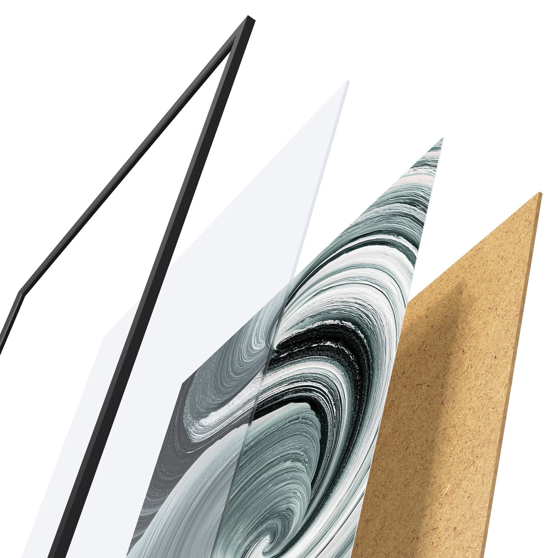 Plagát sa skladá z rámu, plexiskla, vytlačeného obrazu a podkladu z drevotriesky. Plagát možno okamžite zavesiť na stenu vďaka úchytom na zadnej strane.