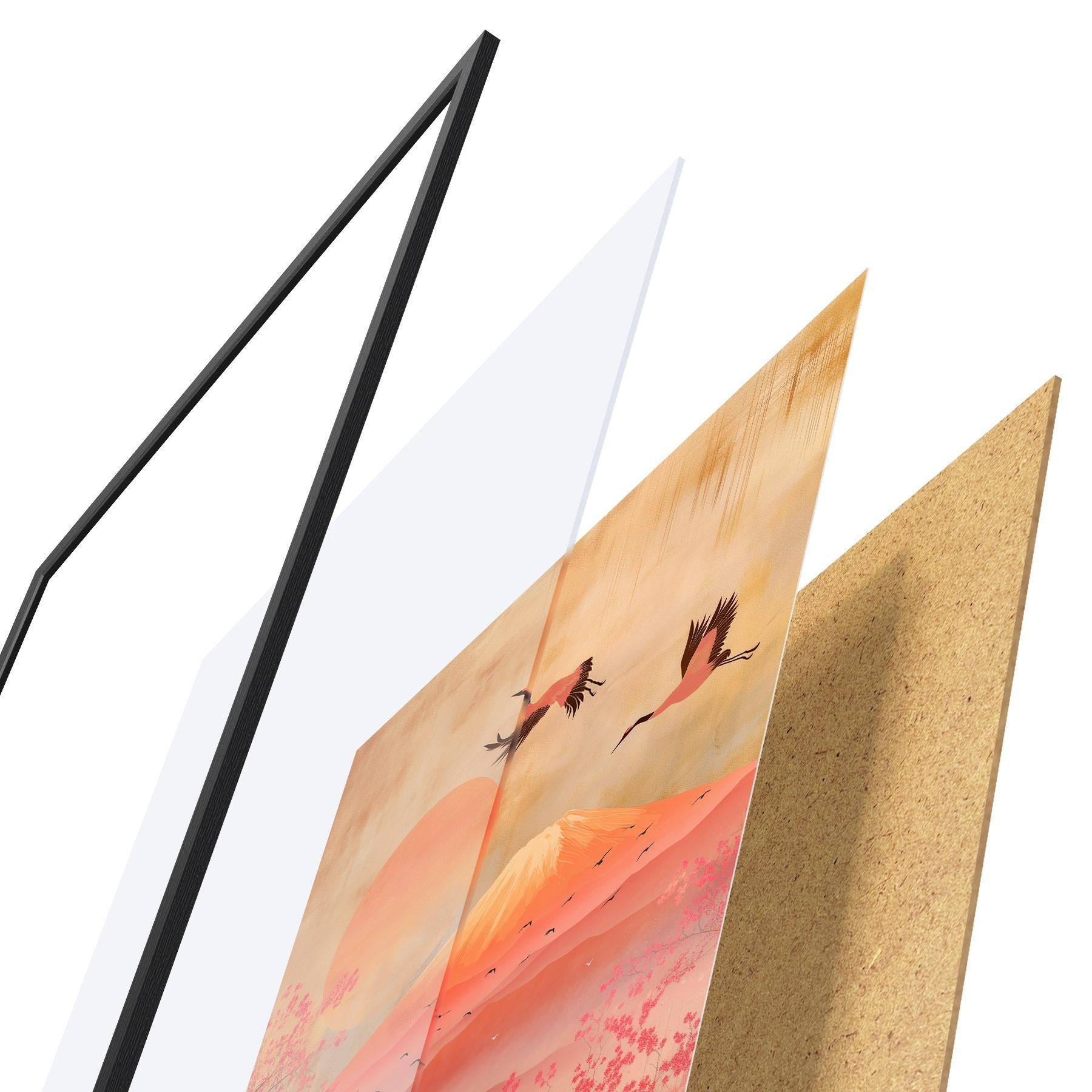Plagát sa skladá z rámu, plexiskla, vytlačeného obrazu a podkladu z drevotriesky. Plagát možno okamžite zavesiť na stenu vďaka úchytom na zadnej strane.