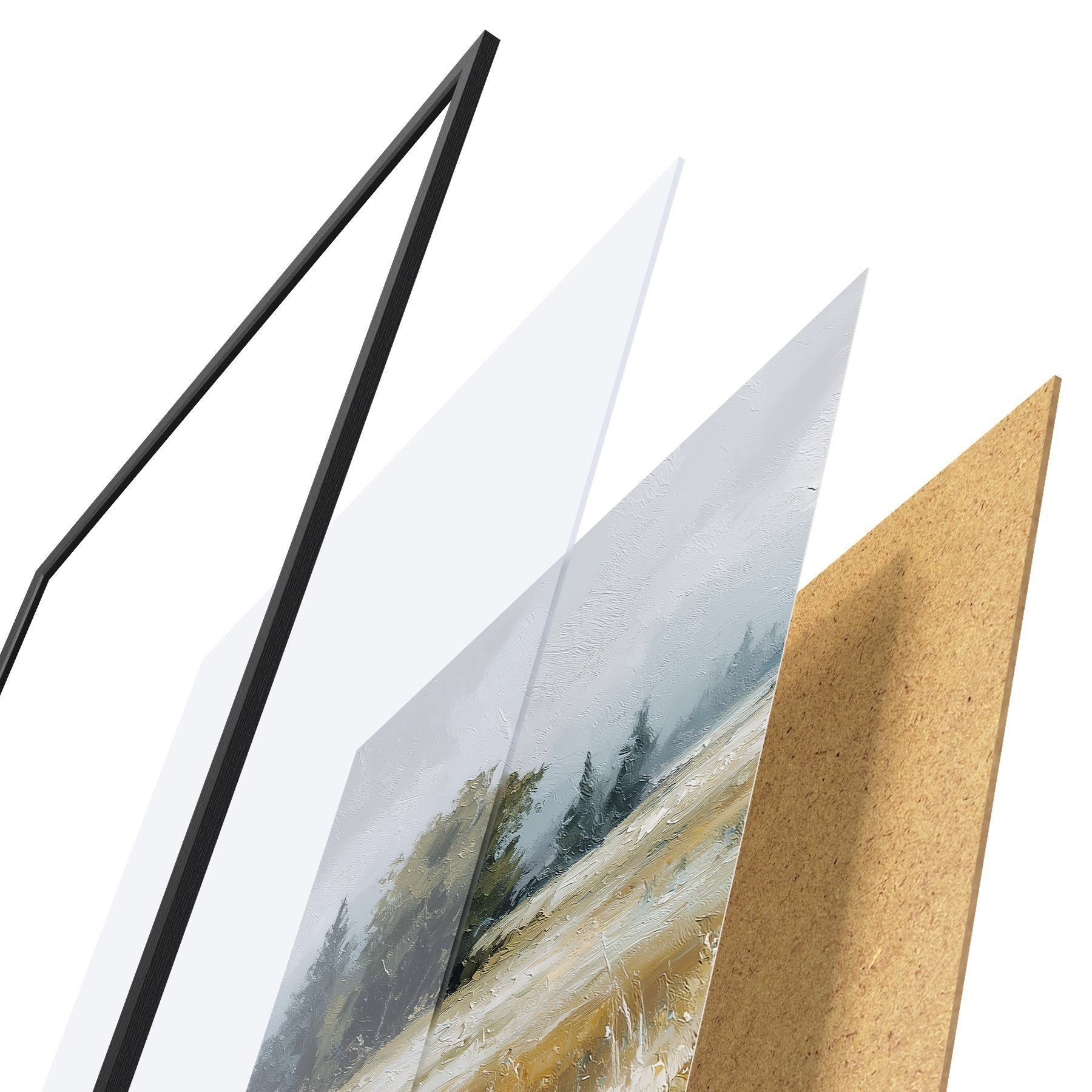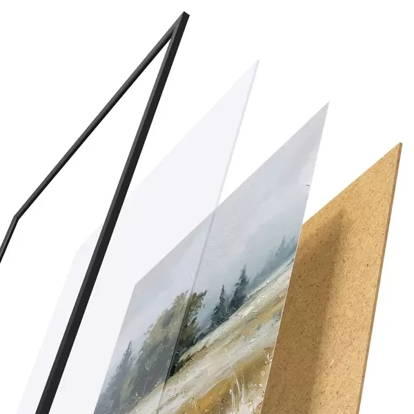 Plagát sa skladá z rámu, plexiskla, vytlačeného obrazu a podkladu z drevotriesky. Plagát možno okamžite zavesiť na stenu vďaka úchytom na zadnej strane.