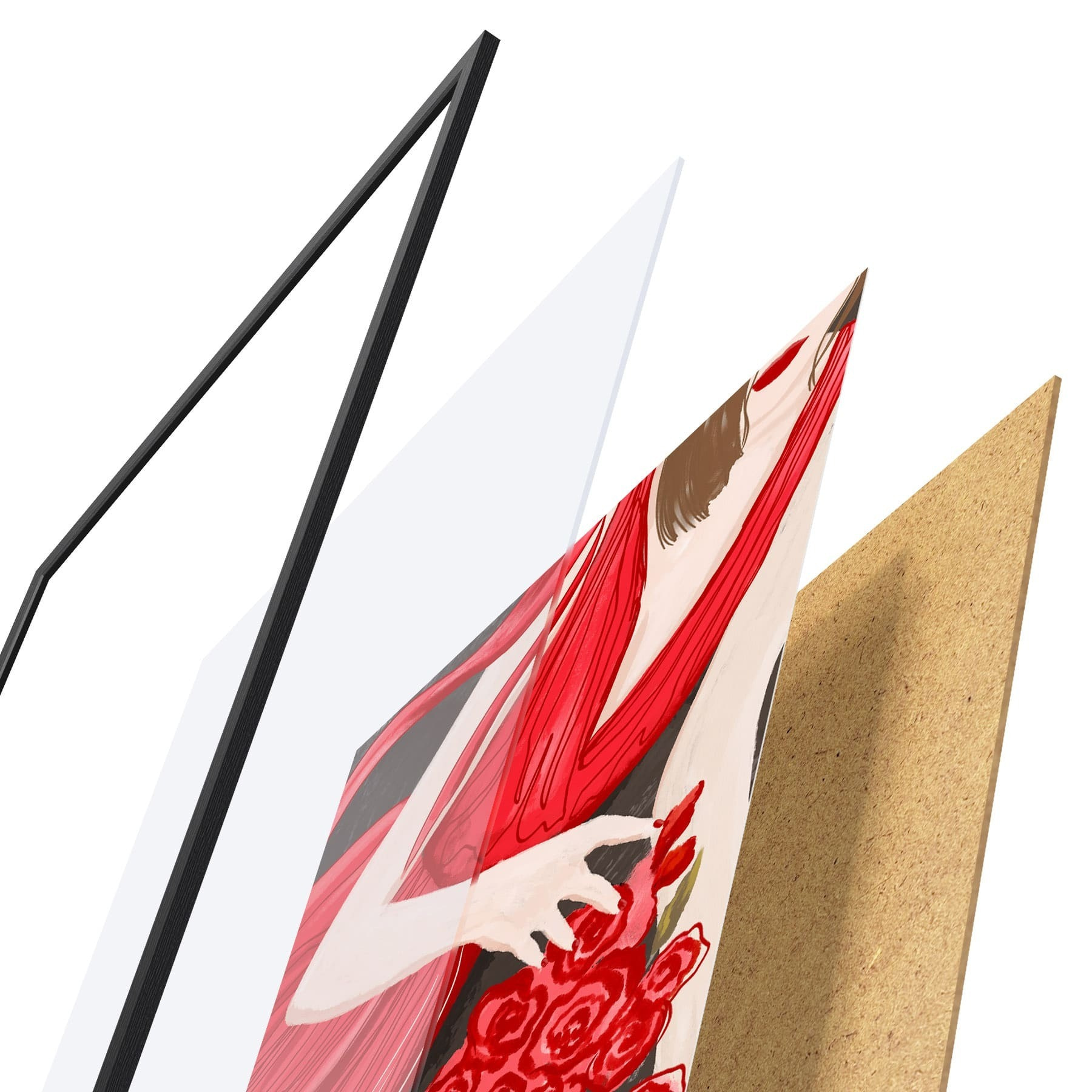Plagát sa skladá z rámu, plexiskla, vytlačeného obrazu a podkladu z drevotriesky. Plagát možno okamžite zavesiť na stenu vďaka úchytom na zadnej strane.