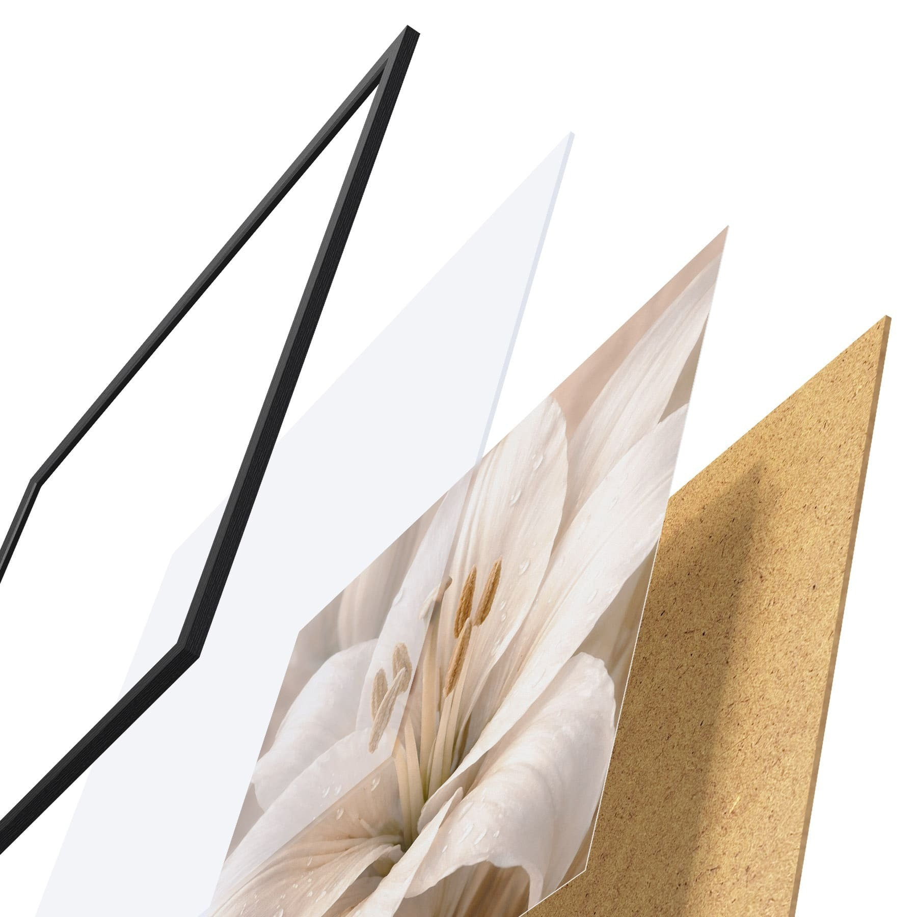 Plagát sa skladá z rámu, plexiskla, vytlačeného obrazu a podkladu z drevotriesky. Plagát možno okamžite zavesiť na stenu vďaka úchytom na zadnej strane.