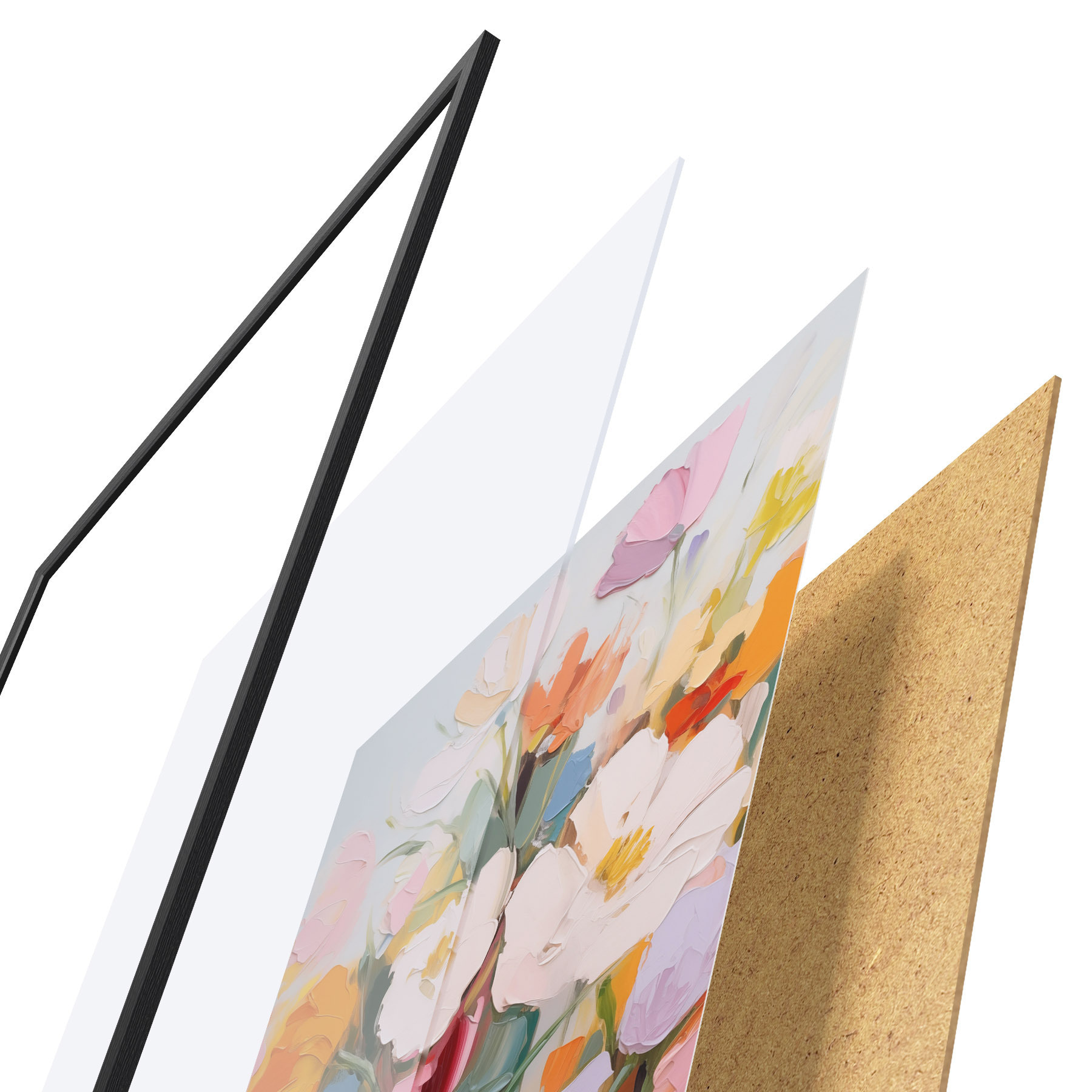 Plagát sa skladá z rámu, plexiskla, vytlačeného obrazu a podkladu z drevotriesky. Plagát možno okamžite zavesiť na stenu vďaka úchytom na zadnej strane.