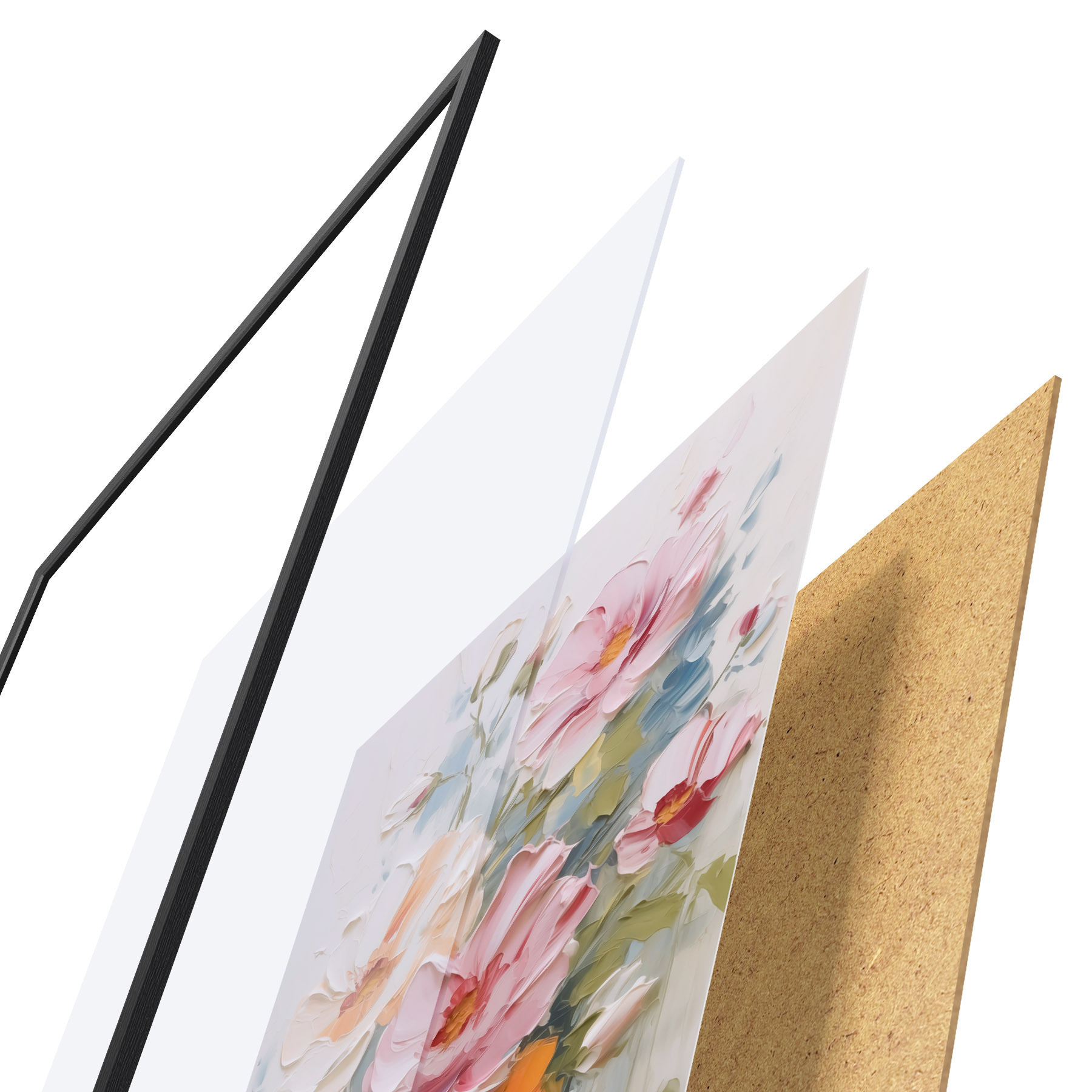 Plagát sa skladá z rámu, plexiskla, vytlačeného obrazu a podkladu z drevotriesky. Plagát možno okamžite zavesiť na stenu vďaka úchytom na zadnej strane.