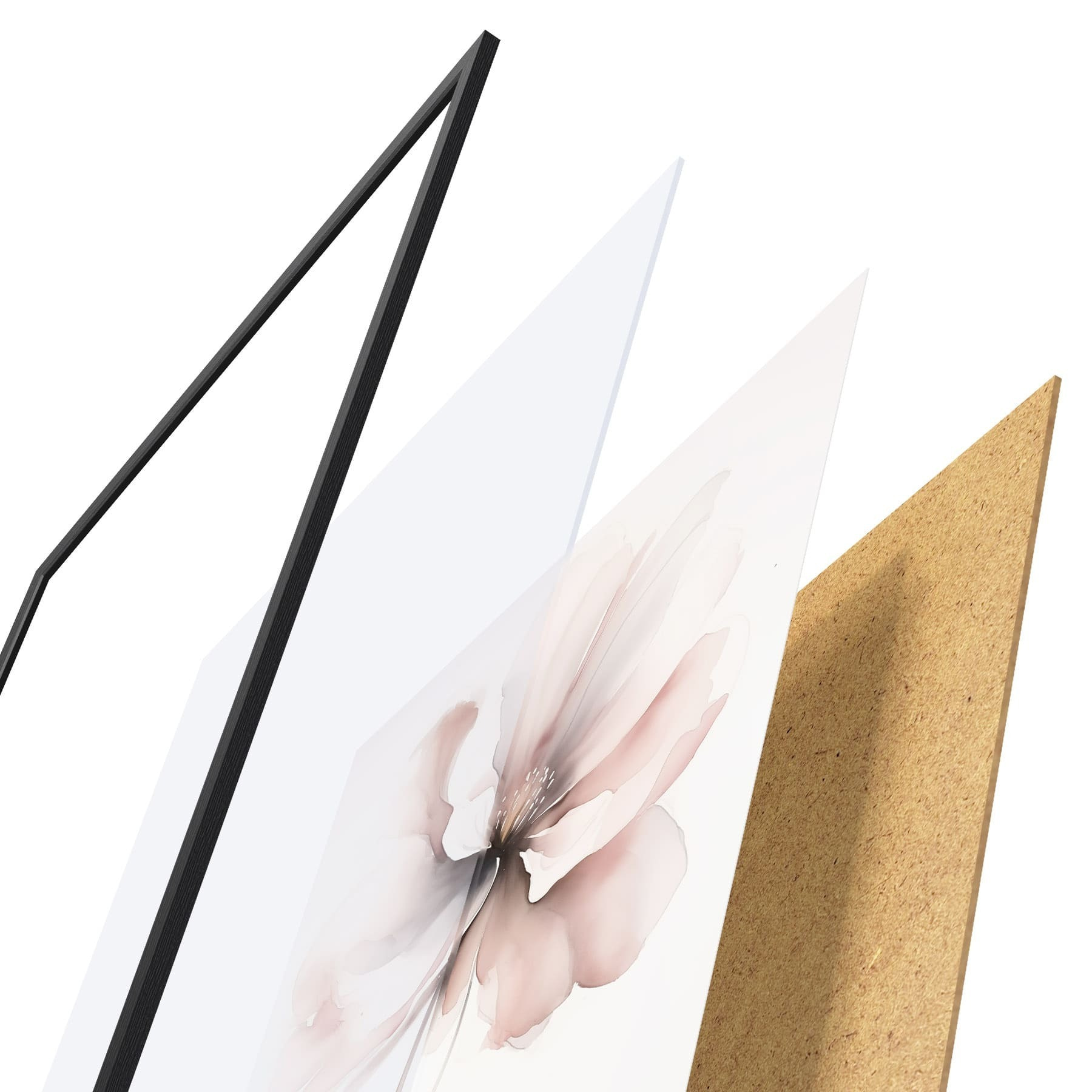 Plagát sa skladá z rámu, plexiskla, vytlačeného obrazu a podkladu z drevotriesky. Plagát možno okamžite zavesiť na stenu vďaka úchytom na zadnej strane.
