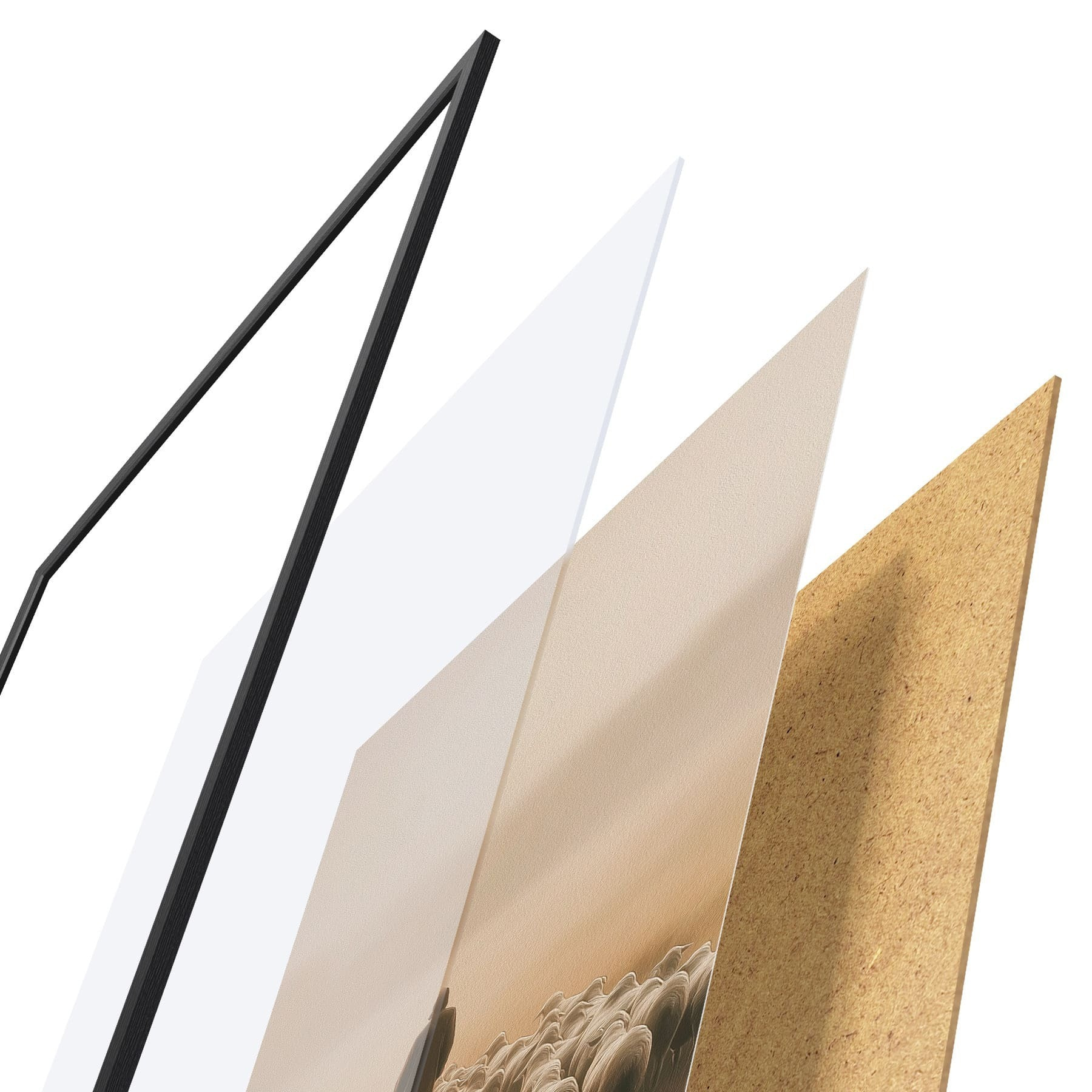 Plagát sa skladá z rámu, plexiskla, vytlačeného obrazu a podkladu z drevotriesky. Plagát možno okamžite zavesiť na stenu vďaka úchytom na zadnej strane.