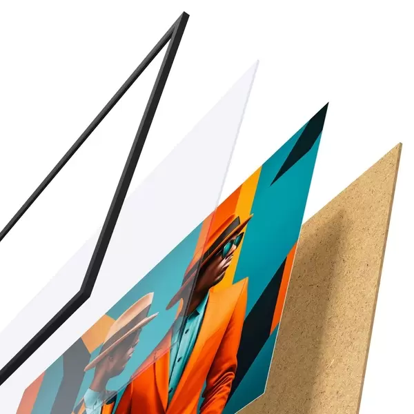 Plagát sa skladá z rámu, plexiskla, vytlačeného obrazu a podkladu z drevotriesky. Plagát možno okamžite zavesiť na stenu vďaka úchytom na zadnej strane.