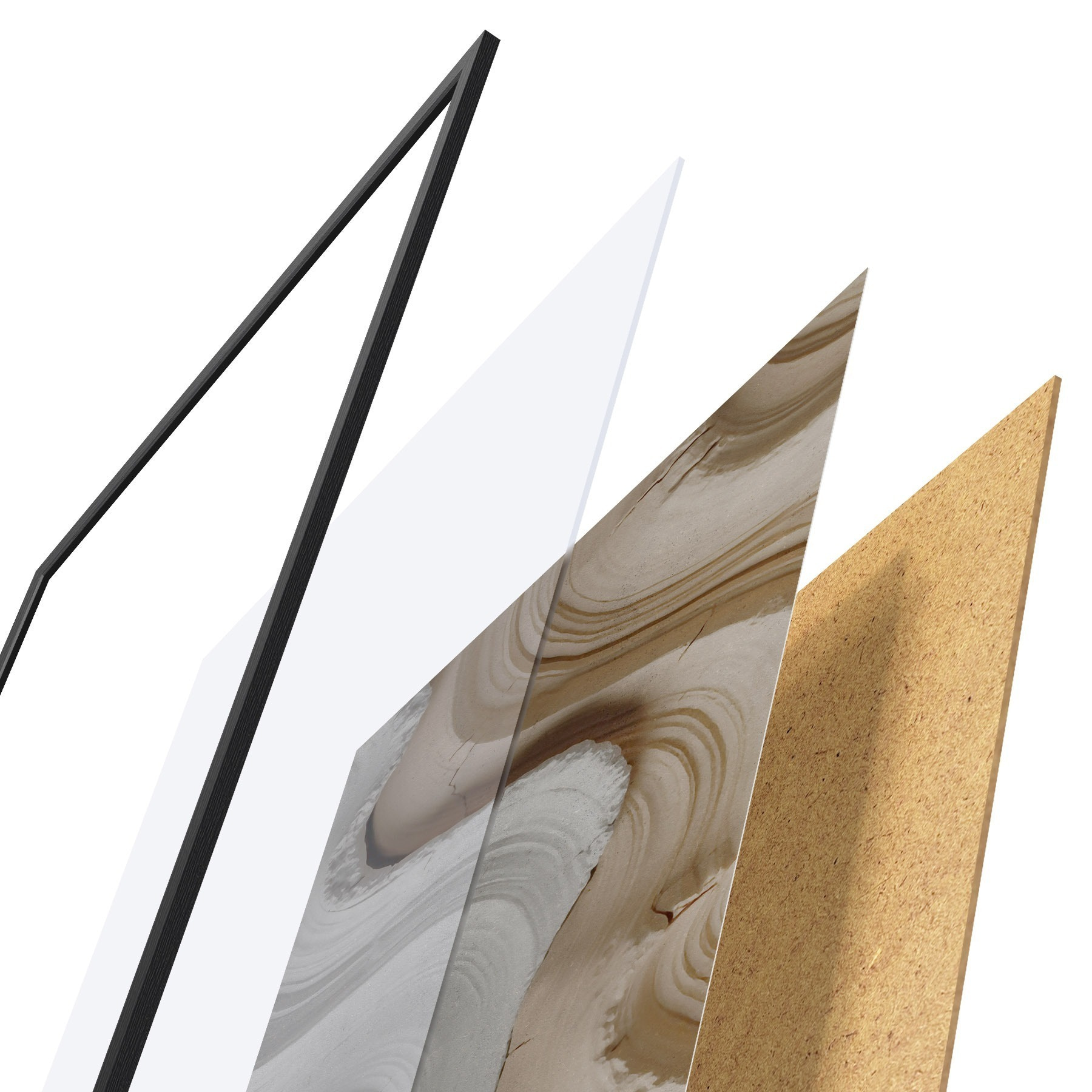 Plagát sa skladá z rámu, plexiskla, vytlačeného obrazu a podkladu z drevotriesky. Plagát možno okamžite zavesiť na stenu vďaka úchytom na zadnej strane.