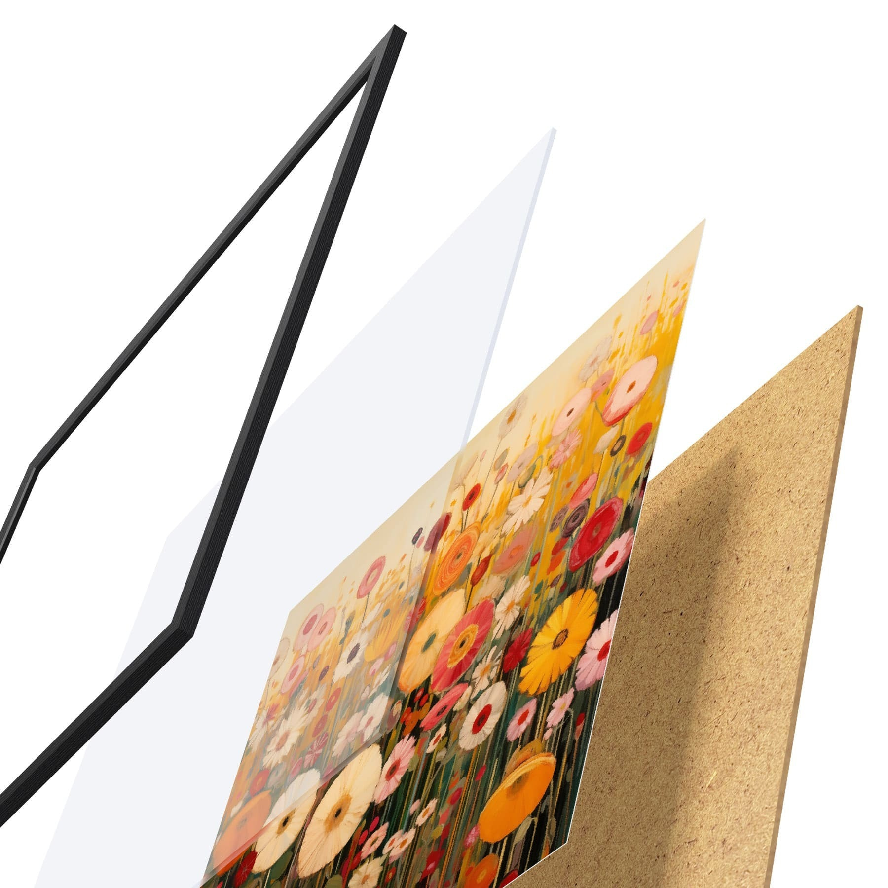 Plagát sa skladá z rámu, plexiskla, vytlačeného obrazu a podkladu z drevotriesky. Plagát možno okamžite zavesiť na stenu vďaka úchytom na zadnej strane.