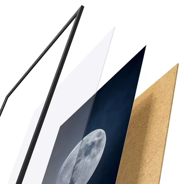 Plagát sa skladá z rámu, plexiskla, vytlačeného obrazu a podkladu z drevotriesky. Plagát možno okamžite zavesiť na stenu vďaka úchytom na zadnej strane.
