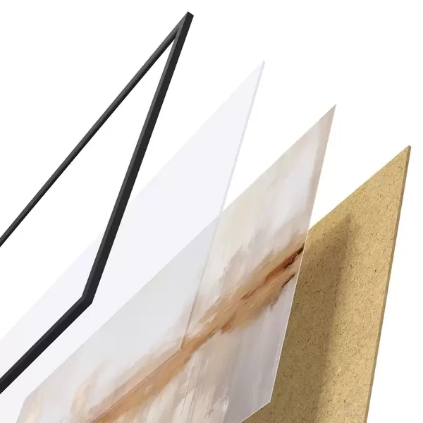 Plagát sa skladá z rámu, plexiskla, vytlačeného obrazu a podkladu z drevotriesky. Plagát možno okamžite zavesiť na stenu vďaka úchytom na zadnej strane.