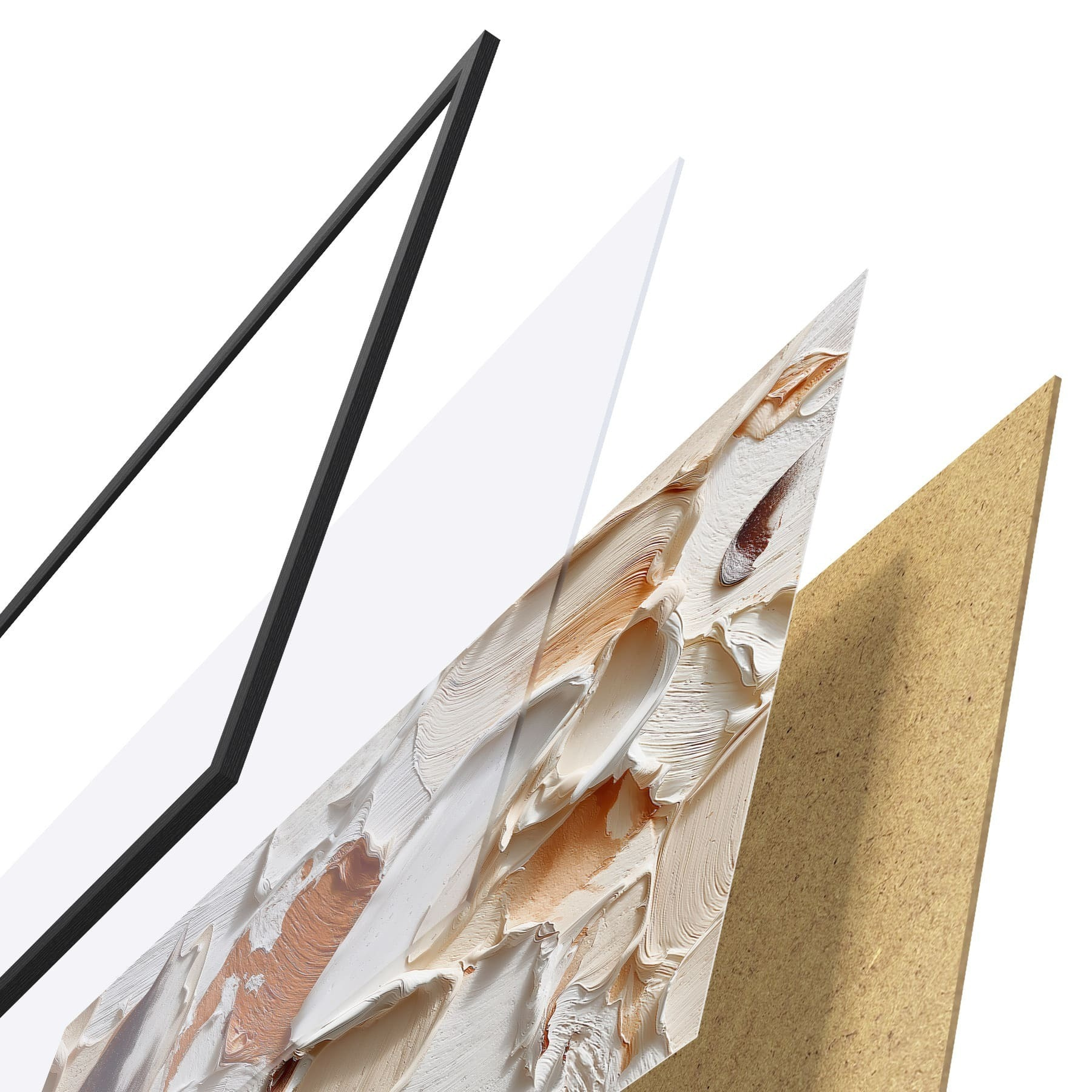 Plagát sa skladá z rámu, plexiskla, vytlačeného obrazu a podkladu z drevotriesky. Plagát možno okamžite zavesiť na stenu vďaka úchytom na zadnej strane.