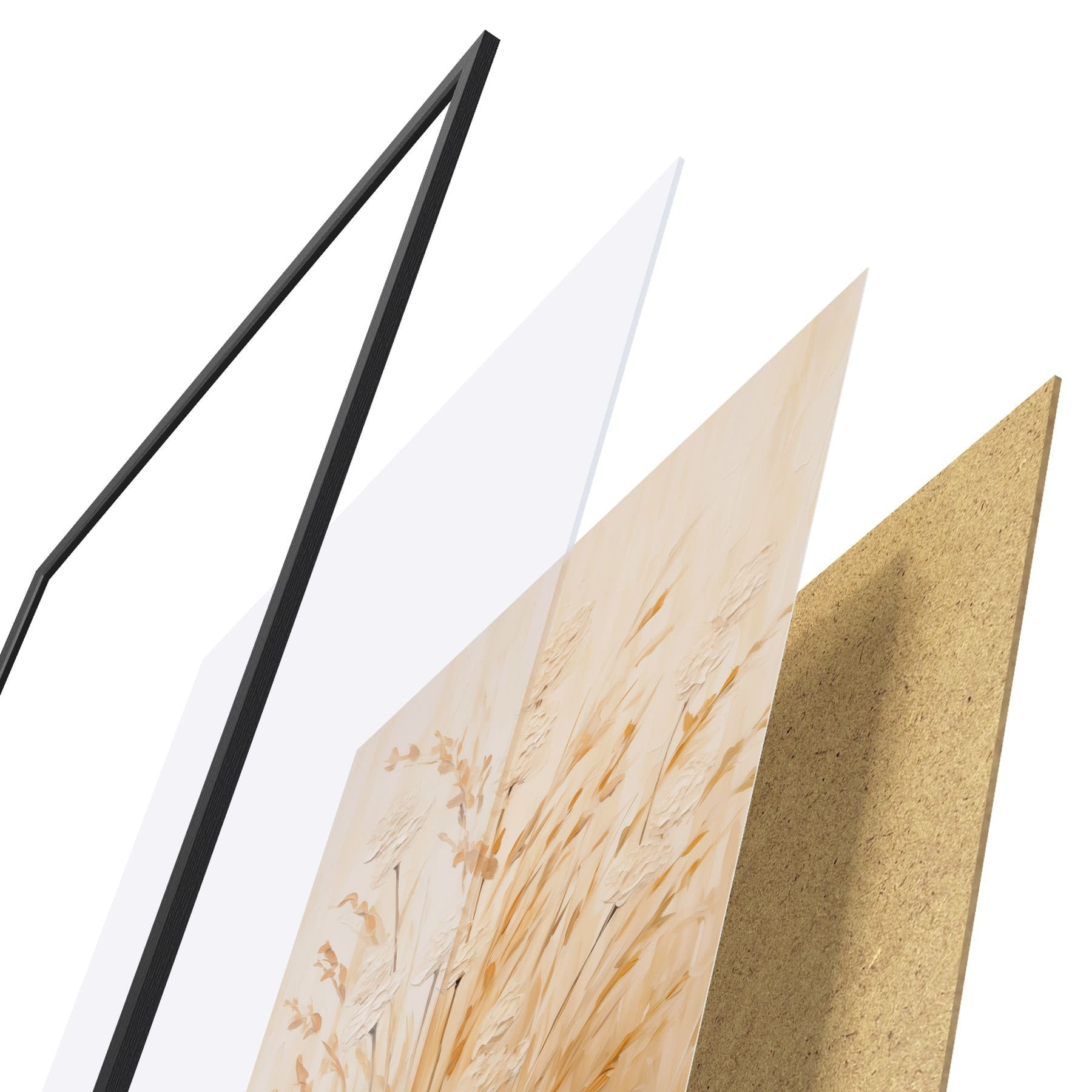 Plagát sa skladá z rámu, plexiskla, vytlačeného obrazu a podkladu z drevotriesky. Plagát možno okamžite zavesiť na stenu vďaka úchytom na zadnej strane.