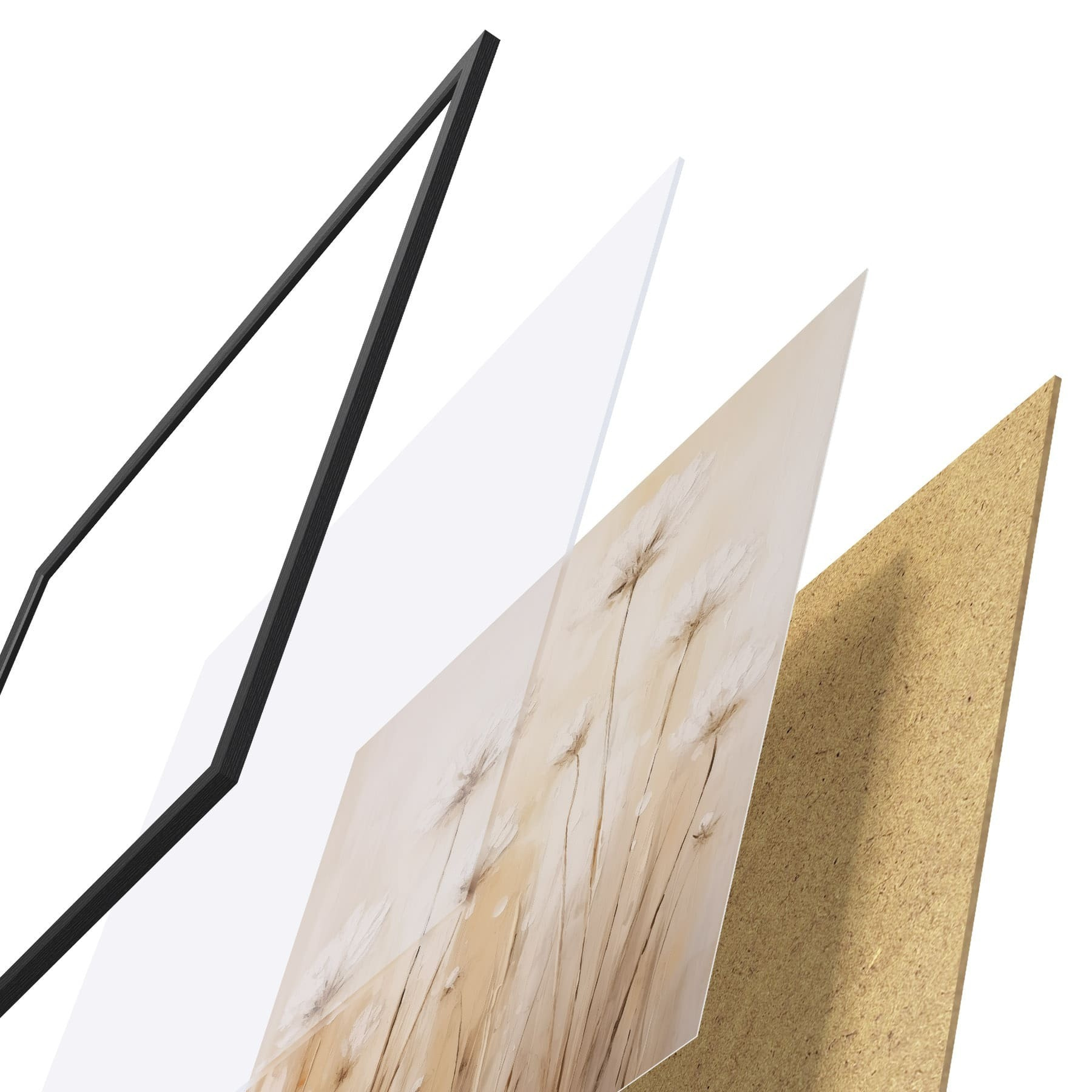 Plagát sa skladá z rámu, plexiskla, vytlačeného obrazu a podkladu z drevotriesky. Plagát možno okamžite zavesiť na stenu vďaka úchytom na zadnej strane.