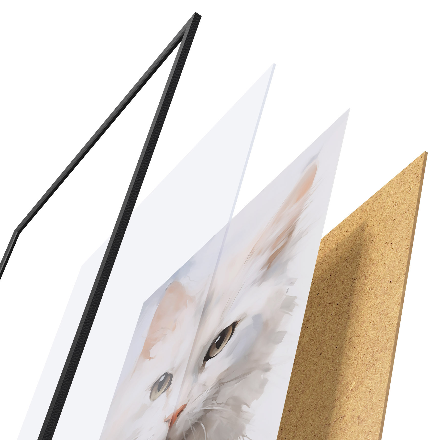 Plagát sa skladá z rámu, plexiskla, vytlačeného obrazu a podkladu z drevotriesky. Plagát možno okamžite zavesiť na stenu vďaka úchytom na zadnej strane.