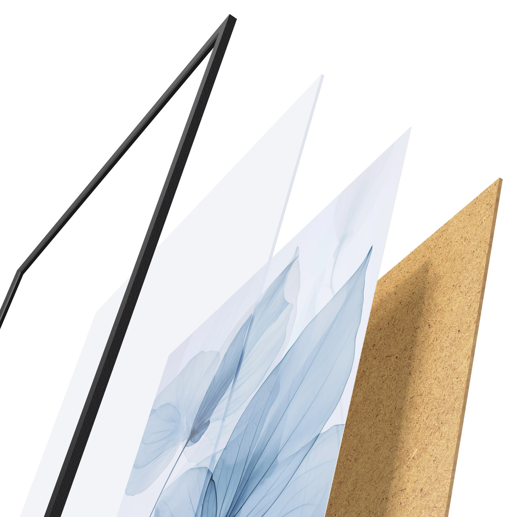 Plagát sa skladá z rámu, plexiskla, vytlačeného obrazu a podkladu z drevotriesky. Plagát možno okamžite zavesiť na stenu vďaka úchytom na zadnej strane.