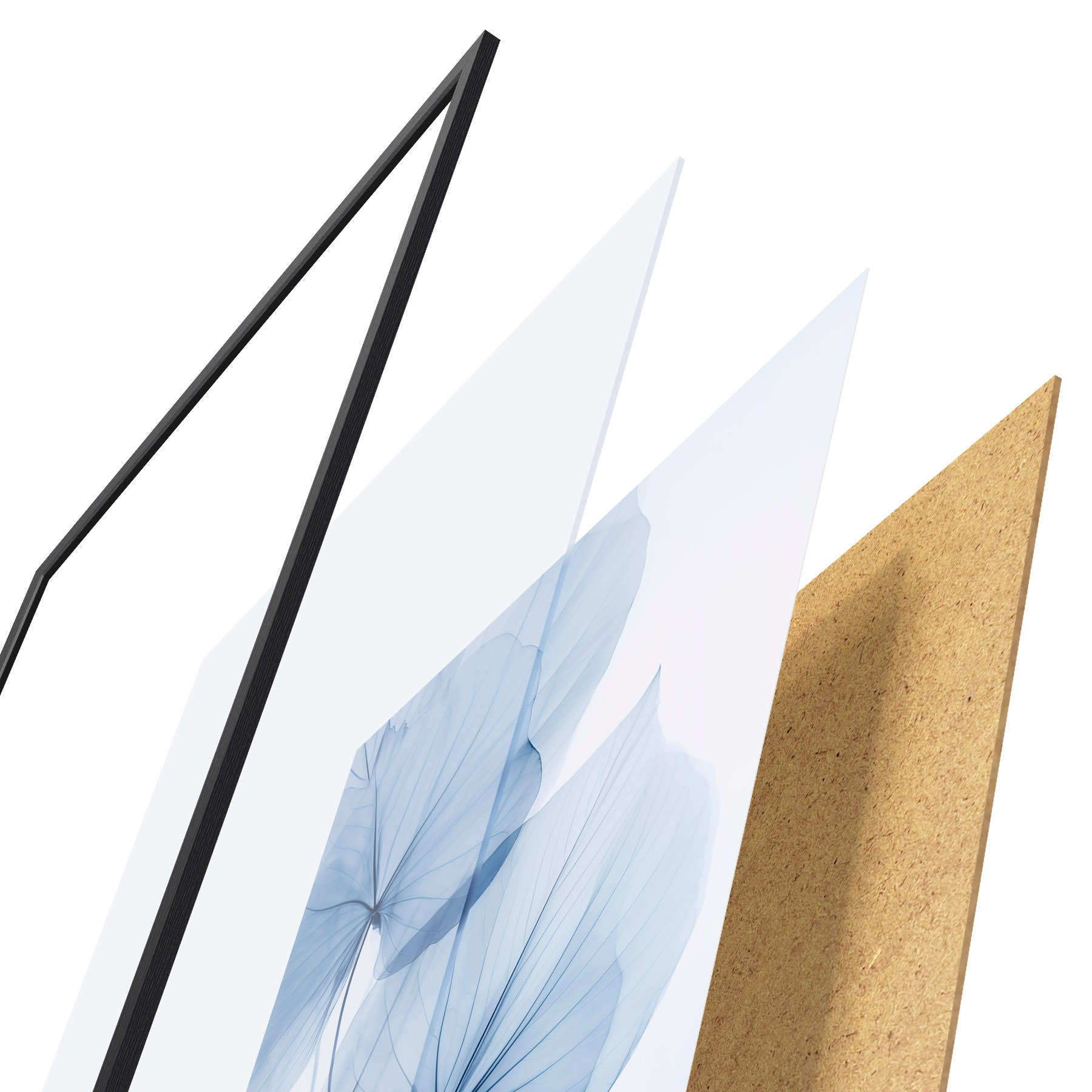 Plagát sa skladá z rámu, plexiskla, vytlačeného obrazu a podkladu z drevotriesky. Plagát možno okamžite zavesiť na stenu vďaka úchytom na zadnej strane.